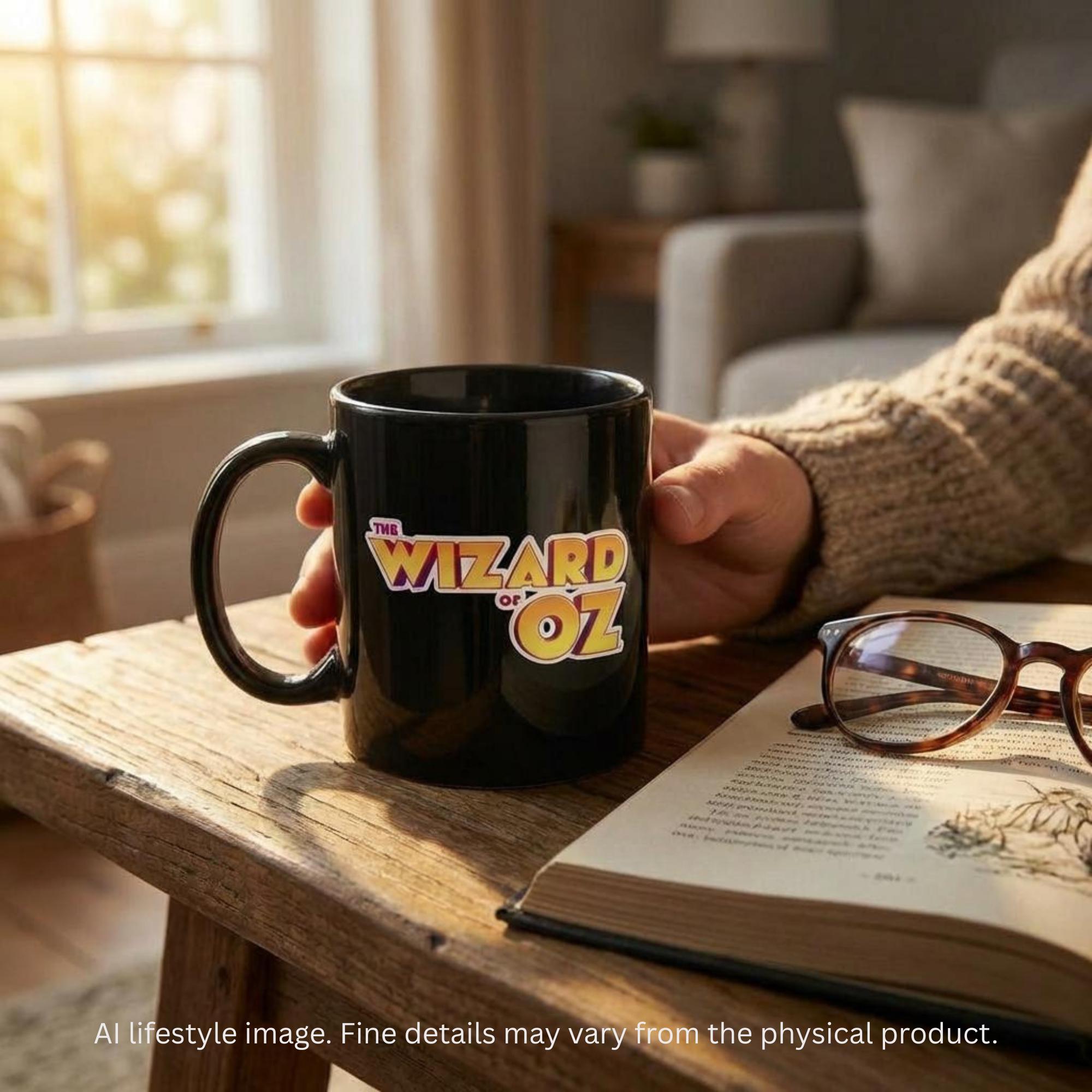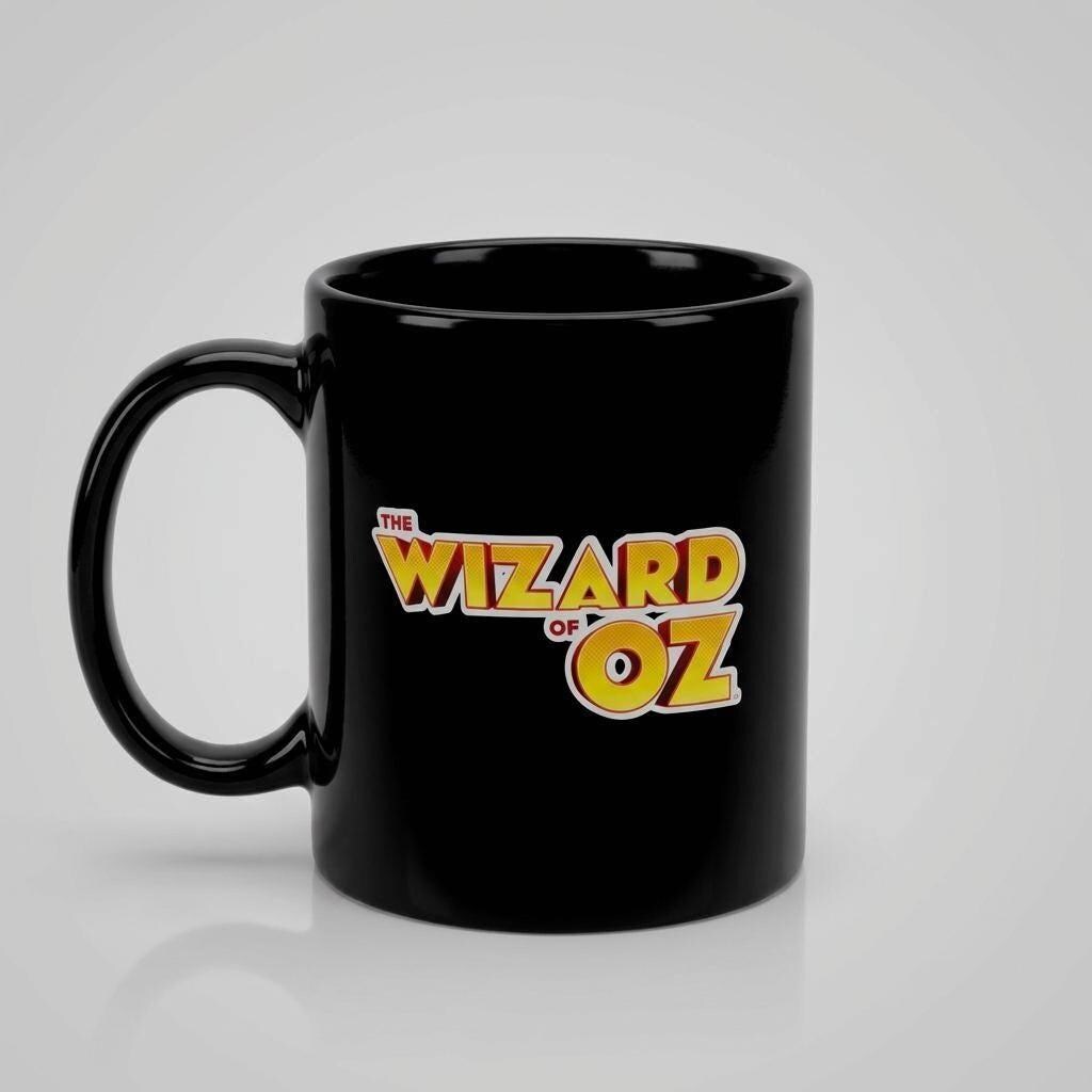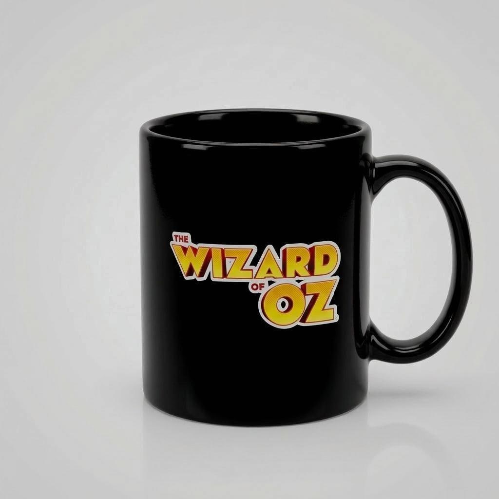 A vintage black ceramic coffee mug featuring classic The Wizard of Oz lettering in bold yellow and red. The glossy finish and iconic logo create a nostalgic accent for a movie themed kitchen or coffee bar.