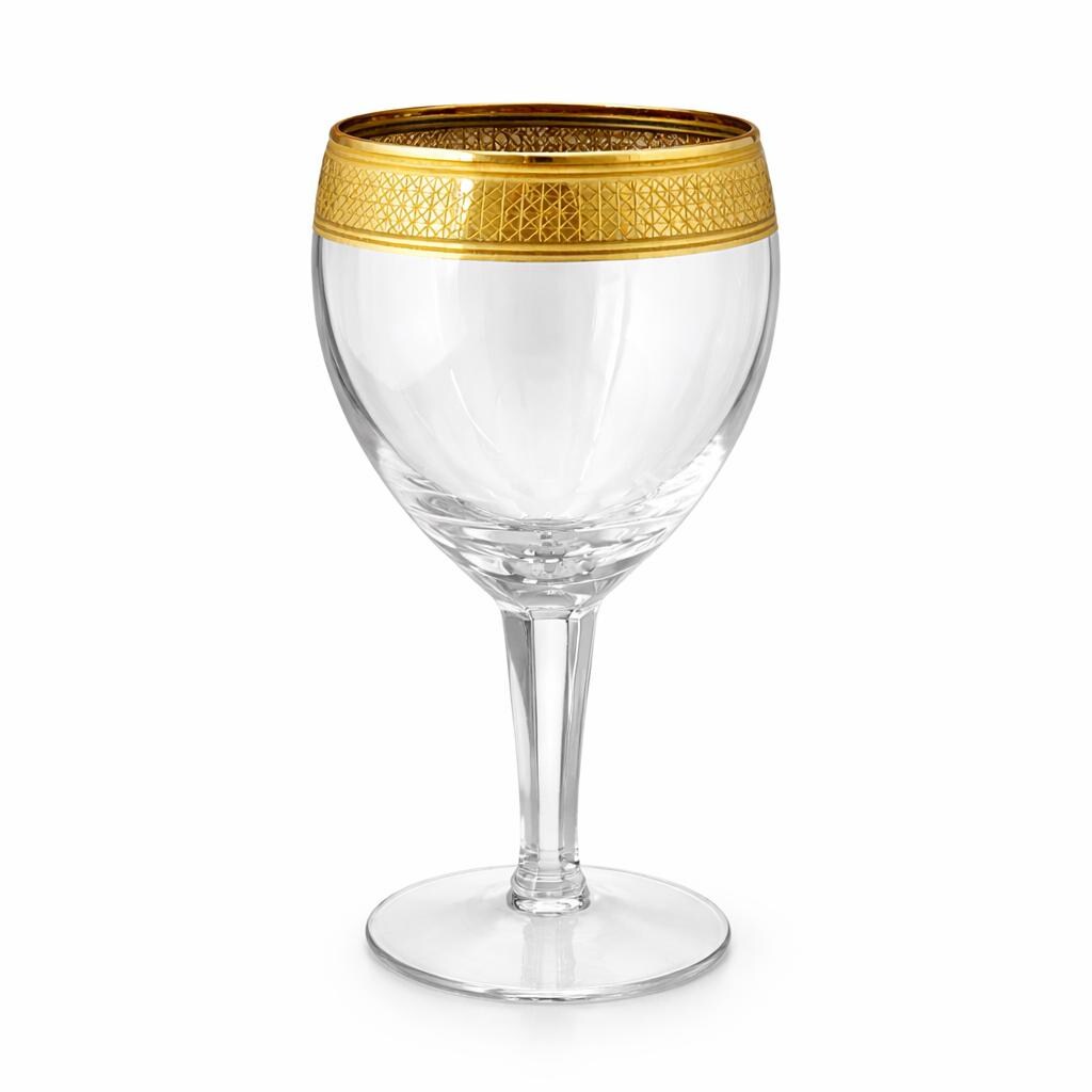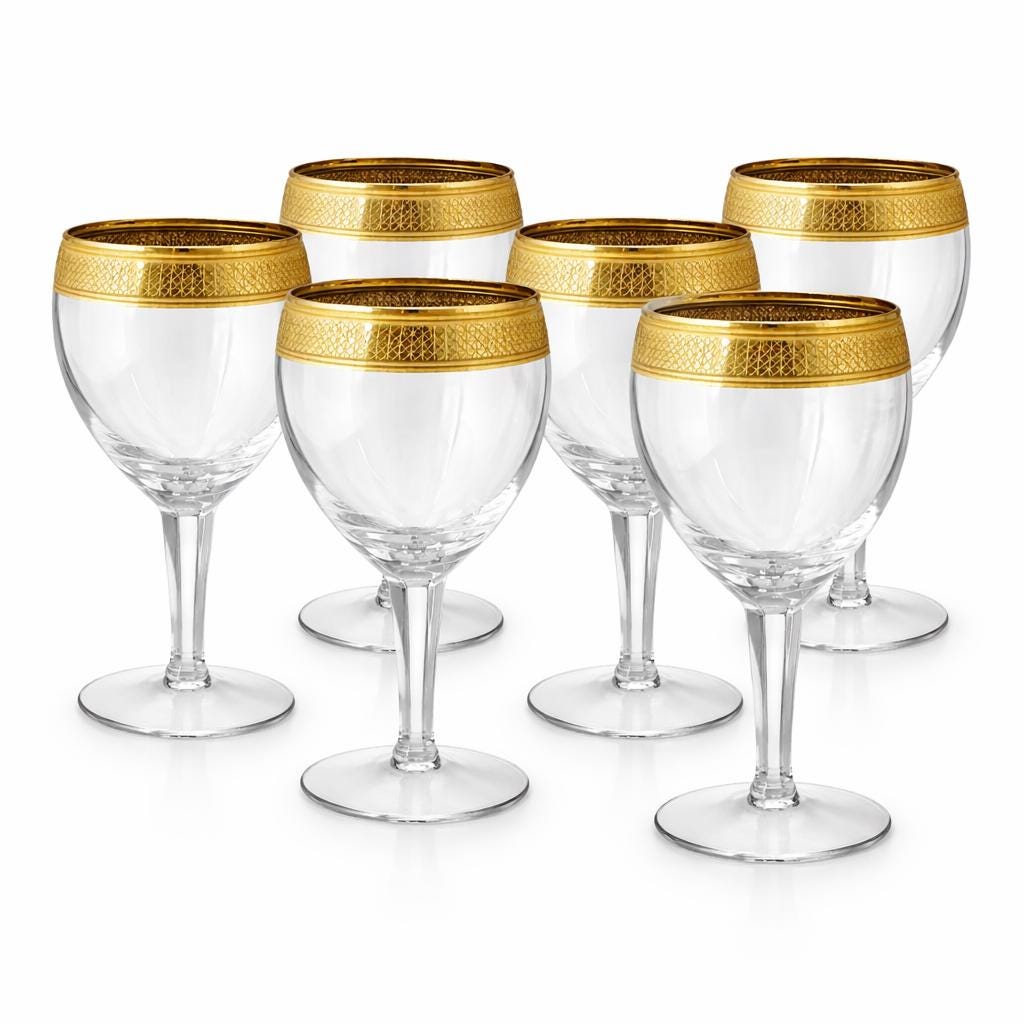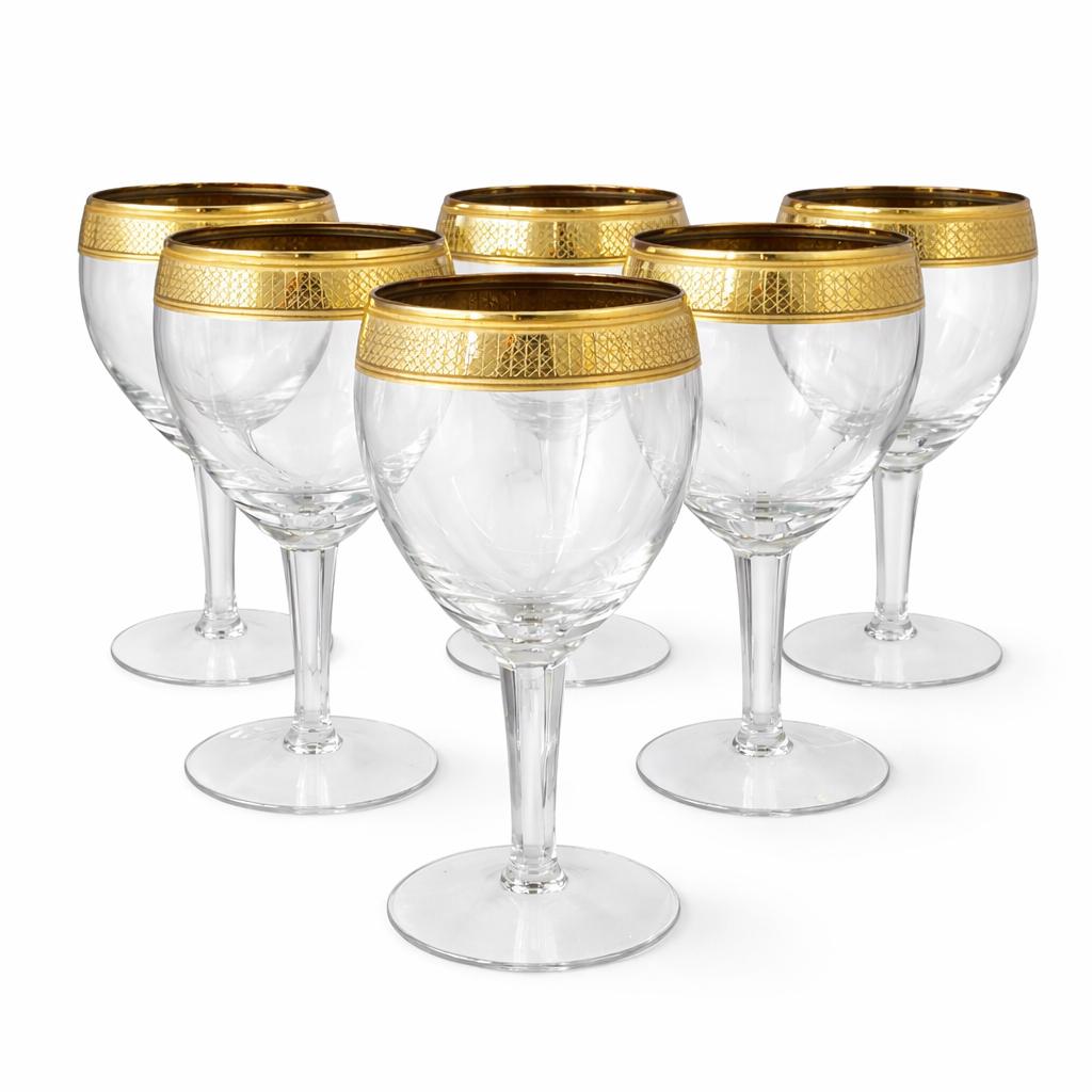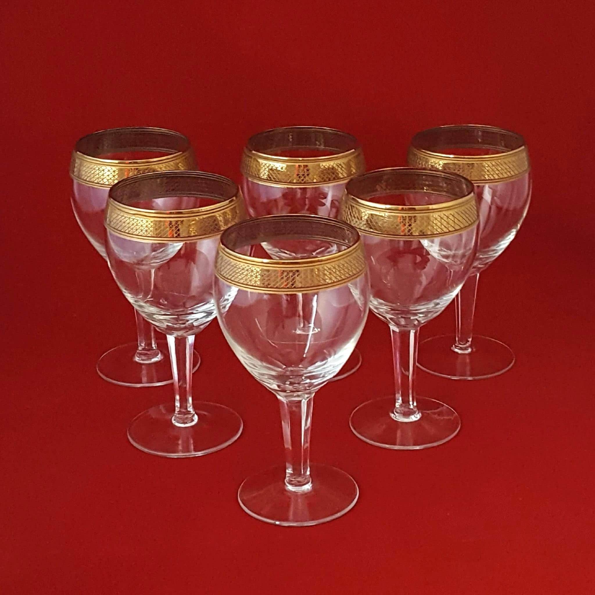 A vintage set of six mid century wine glasses featuring a wide cross hatched gilt band at the rim. Each glass rises from a hexagonal cut stem to a simple foot, with a gently flared bowl suited to red, white, or sparkling pours.