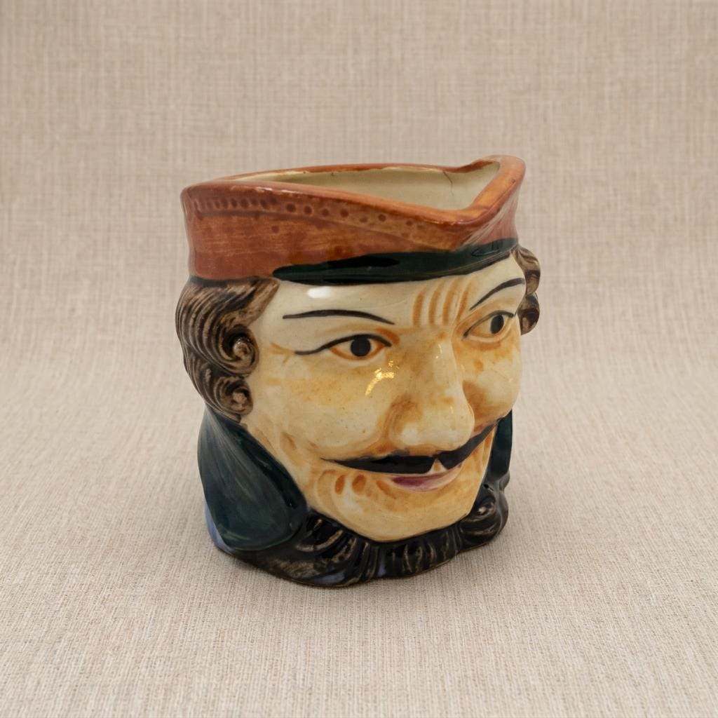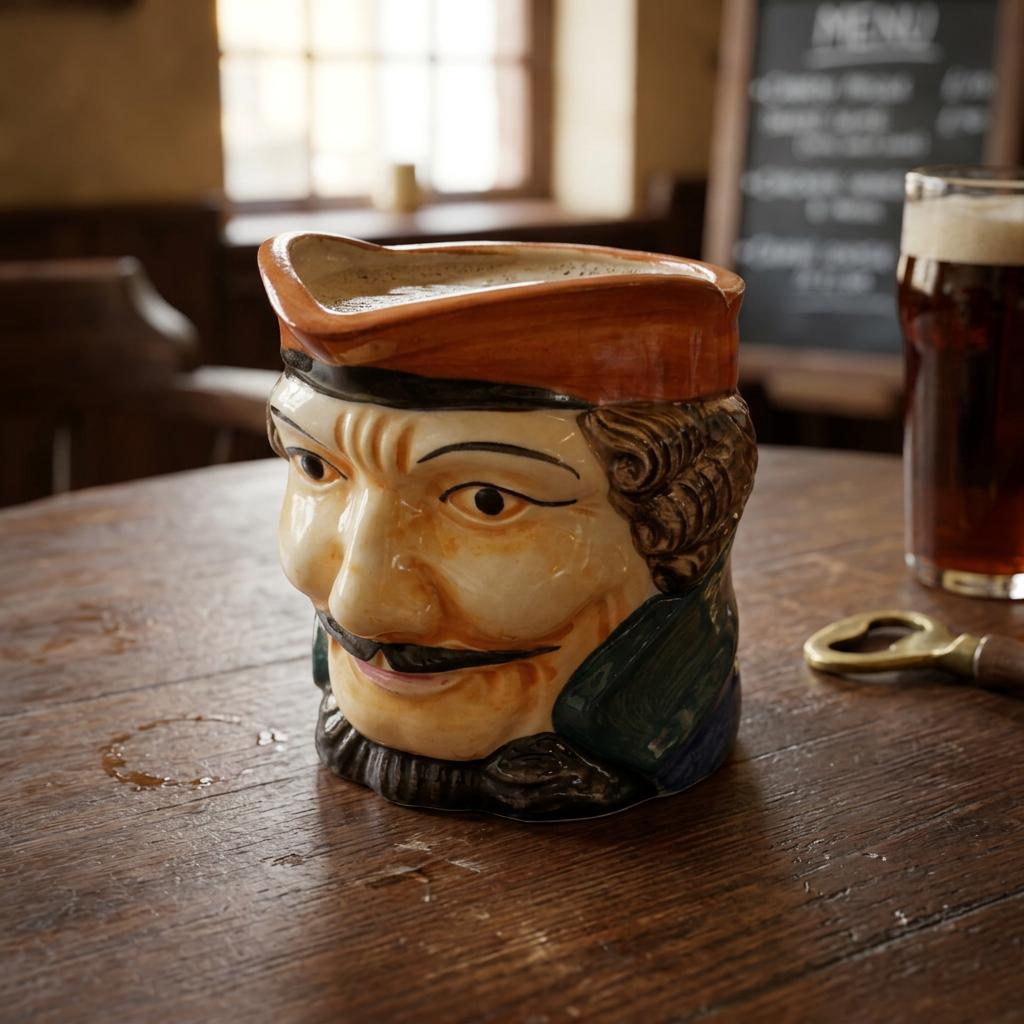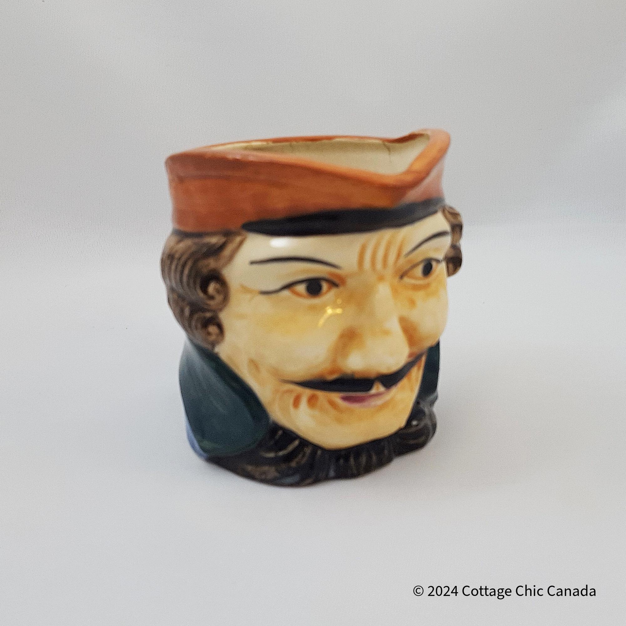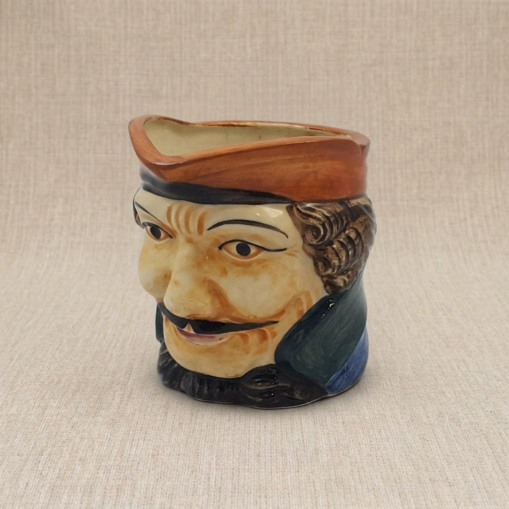 A vibrant hand-painted Toby Jug featuring a character with a curled mustache and brown hat — equally charming as décor, planter, or desktop organizer.