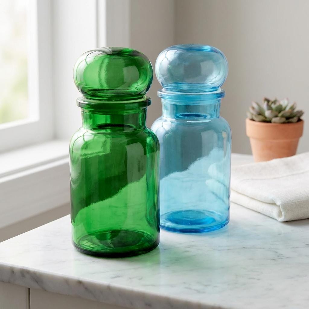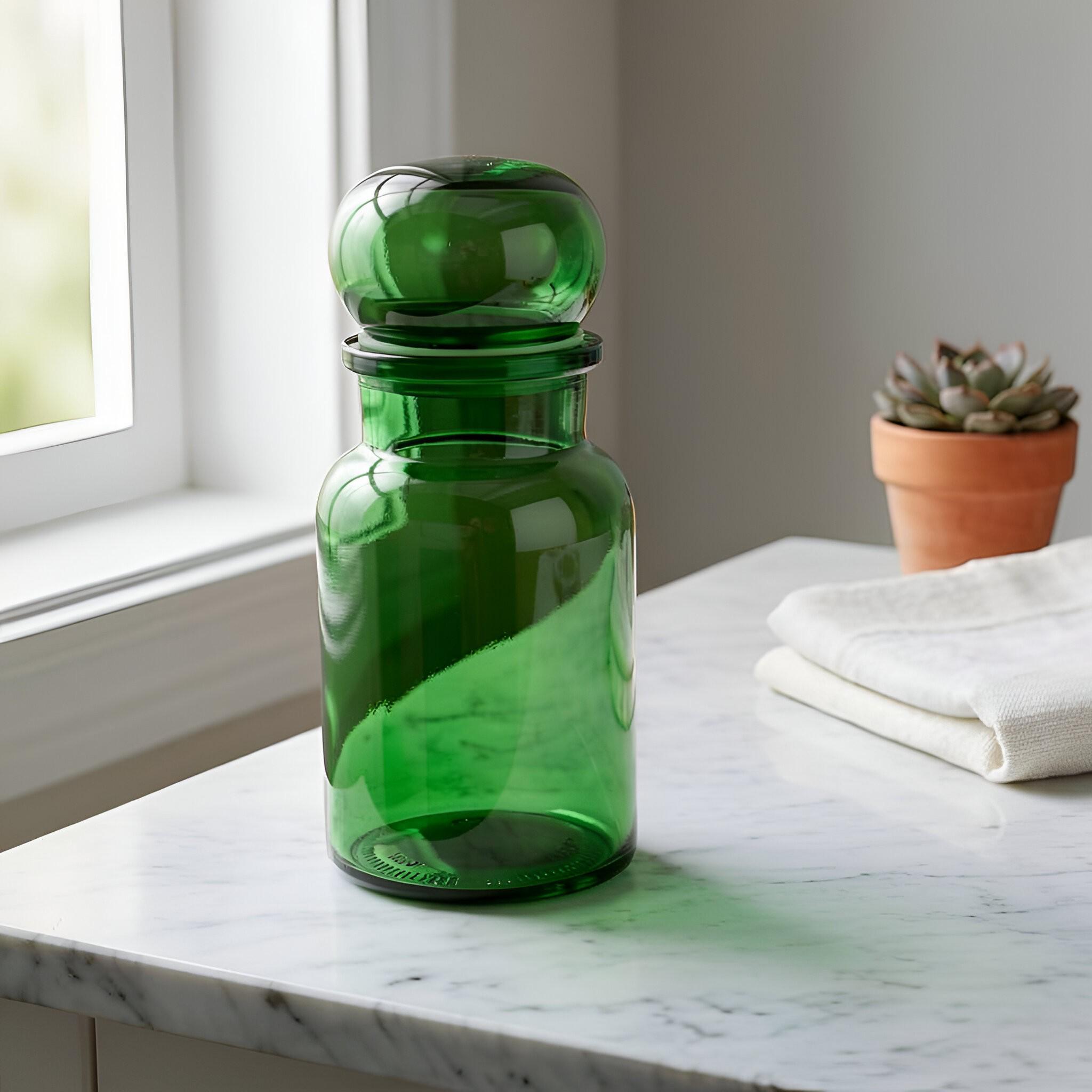 Mid-century European apothecary jars were designed for practical storage while adding visual impact to kitchens and bath spaces. The saturated emerald tone and clean lines reflect a timeless approach to everyday organization with decorative appeal.