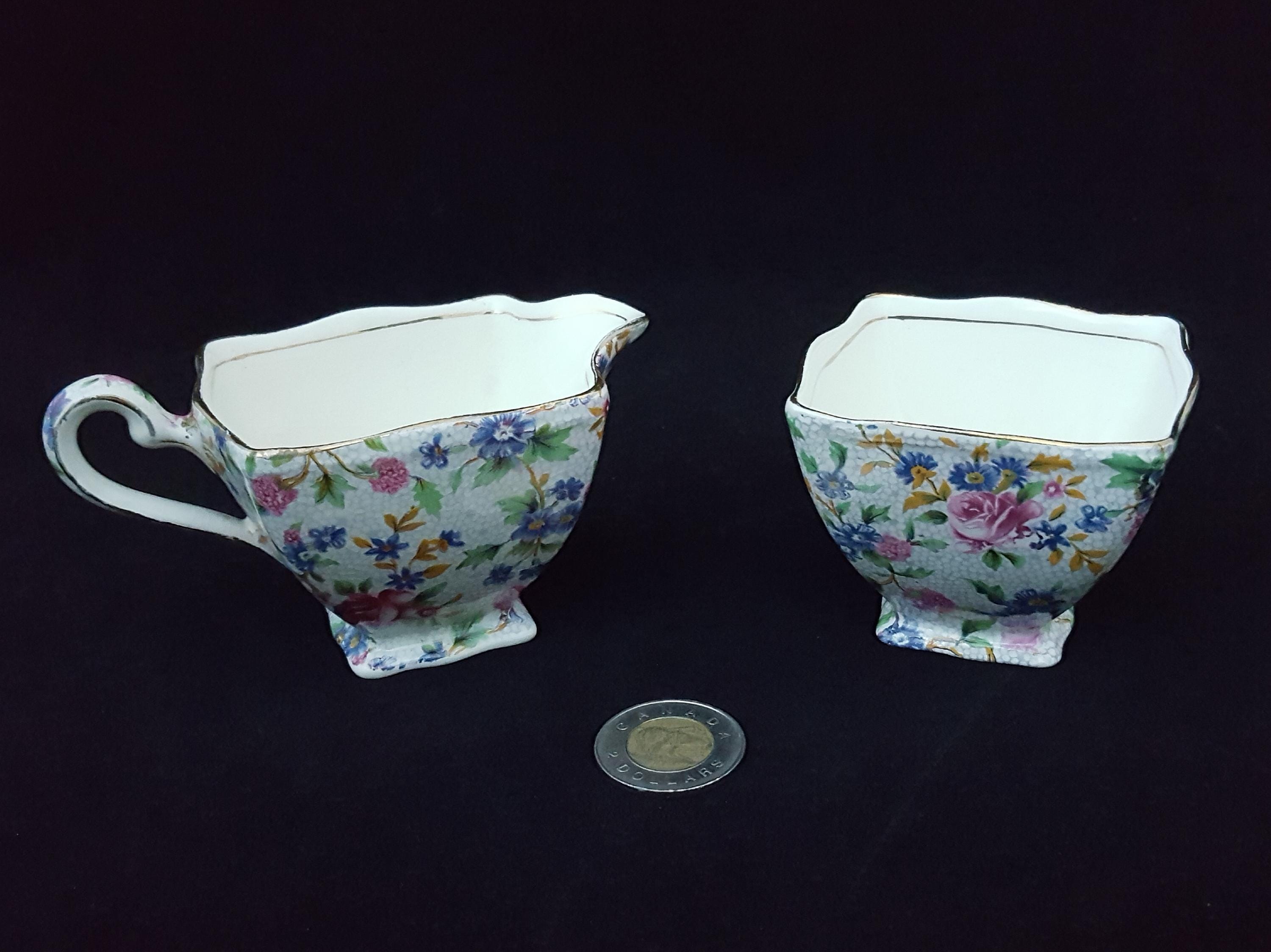 The Old Cottage Chintz pattern was produced by Royal Winton Grimwades from 1932 to 1960 and remains one of the firm’s most recognizable and collected designs. Square Ascot form pieces date to the mid 20th century, with this set bearing backstamps consistent with manufacture between 1934 and 1950. Cream and sugar sets were central to English tea service and are now valued as both functional accents and display pieces within chintzware collections.