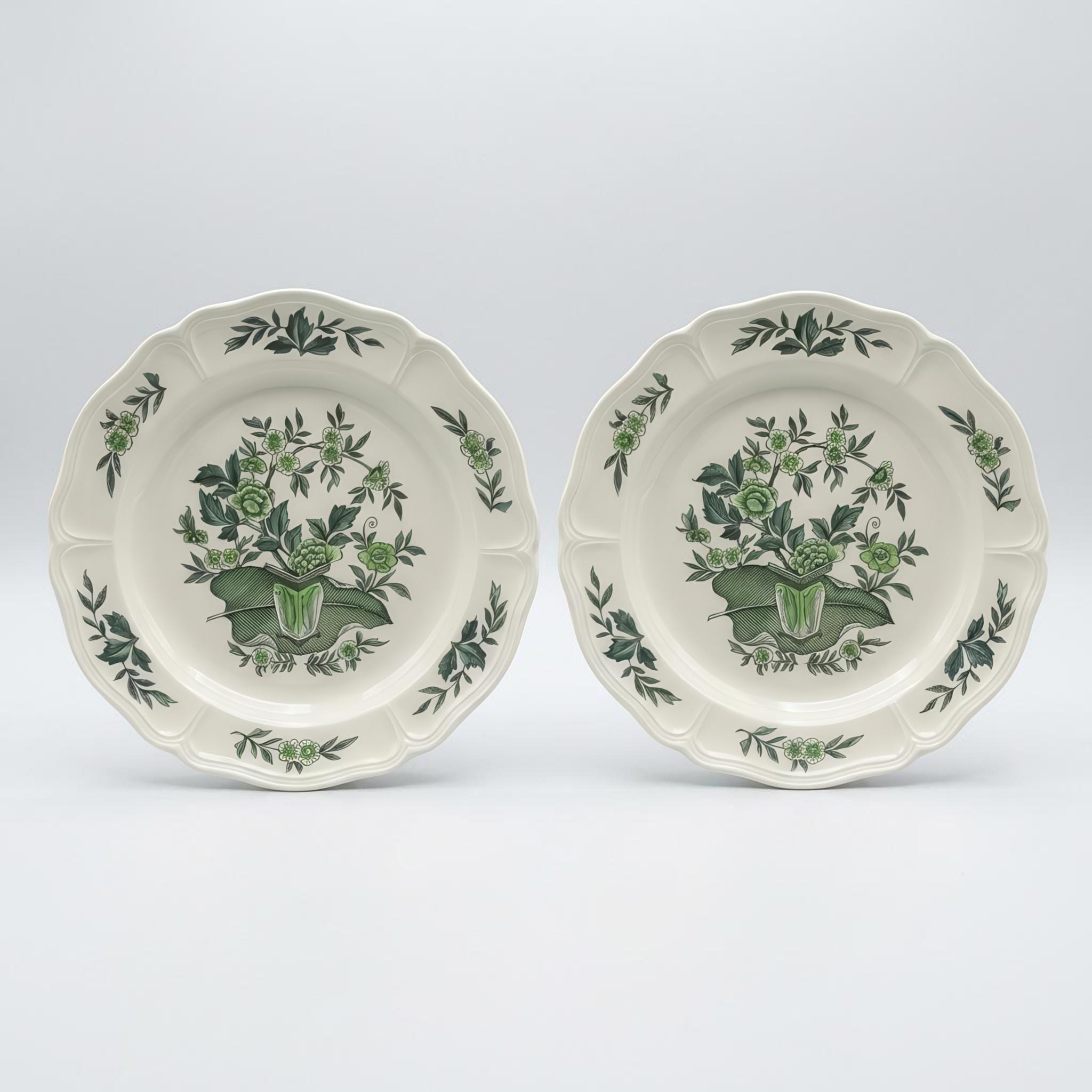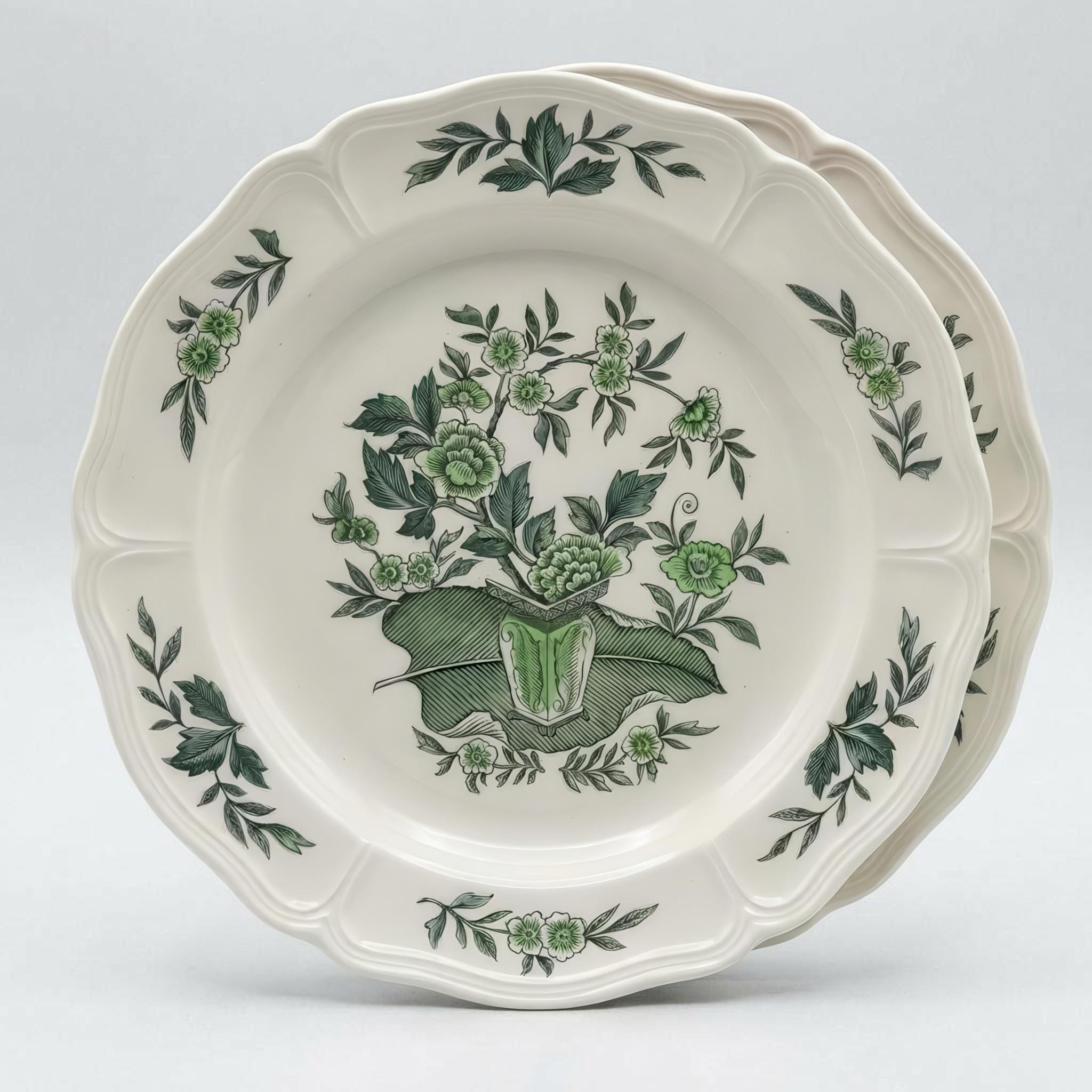 A graceful pair of Wedgwood Green Leaf salad plates in the classic Queen’s Shape, produced at the Barlaston factory in England between 1949 and 1957. The soft off white ground is adorned with stylized green florals and delicate scrolling stems, offering timeless charm for luncheon settings and layered traditional tables.