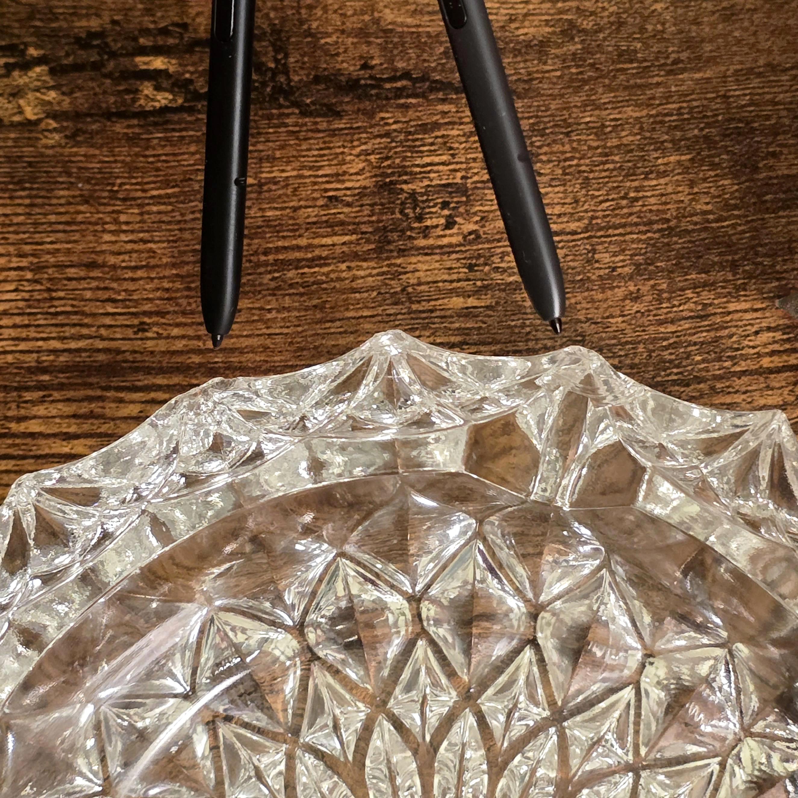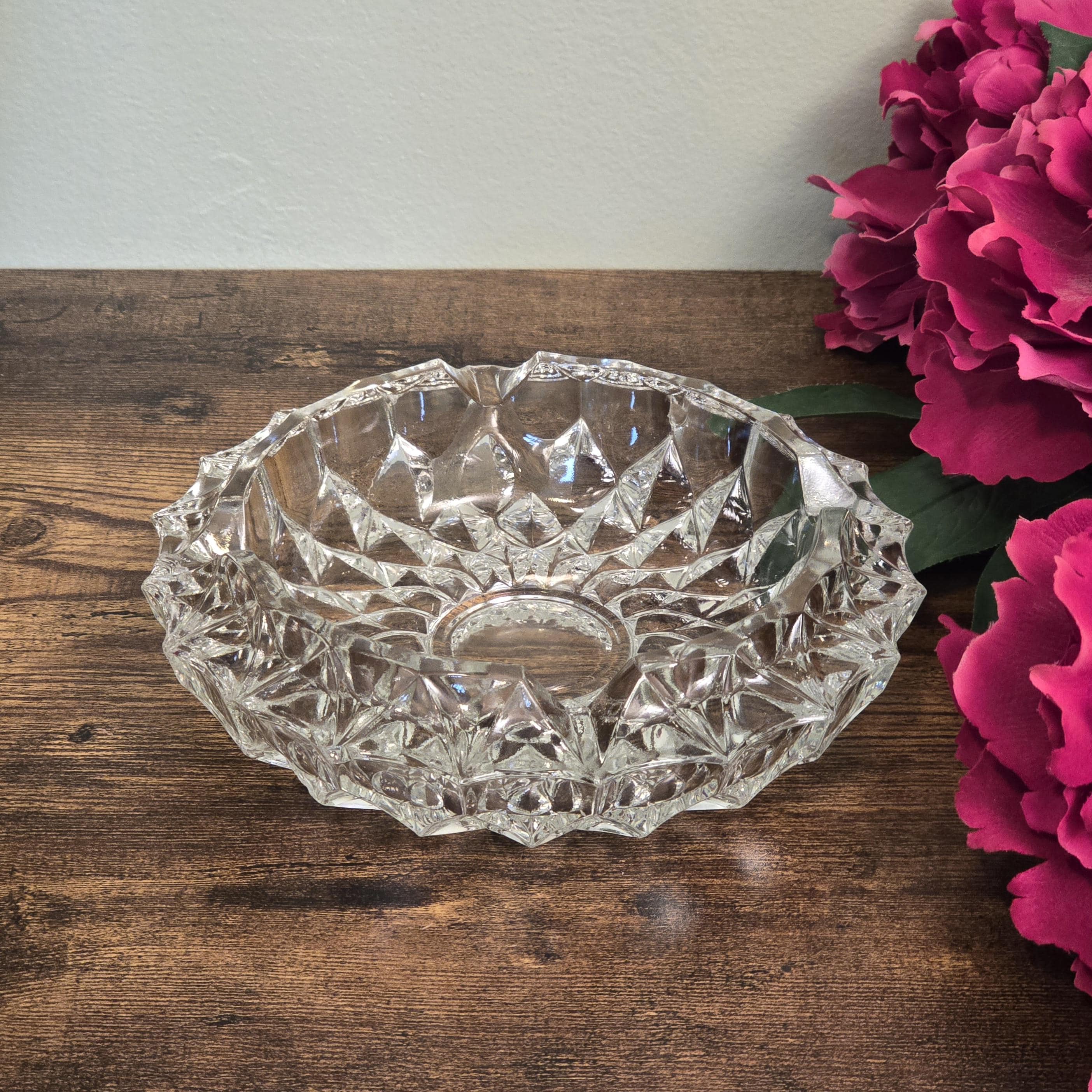 A striking heavy cut crystal ashtray ideal for retro bar styling, elegant décor, or repurposed use as a catchall, bringing brilliant Belgian craftsmanship to mid century inspired interiors.