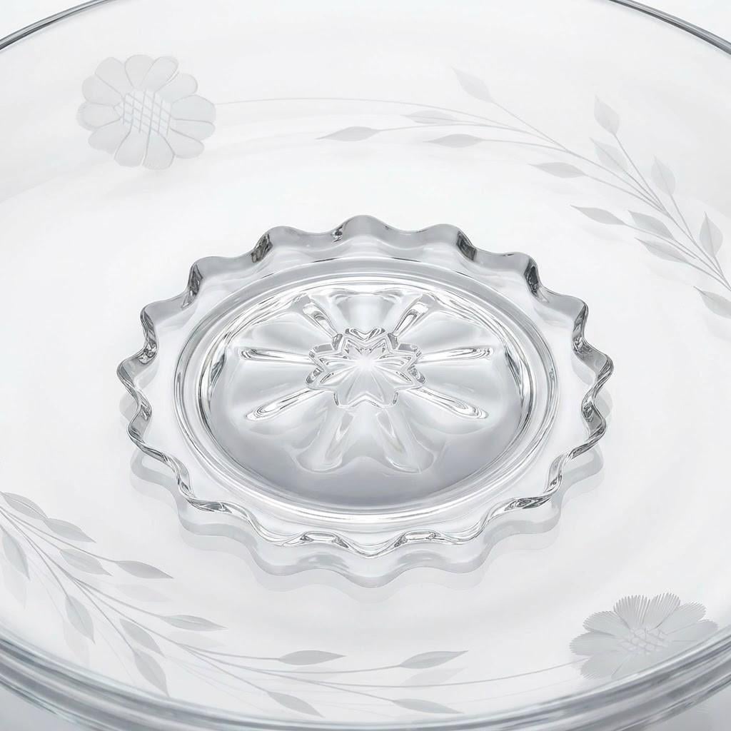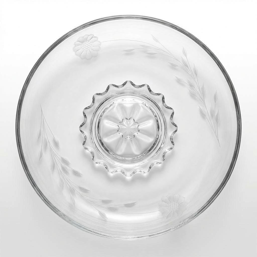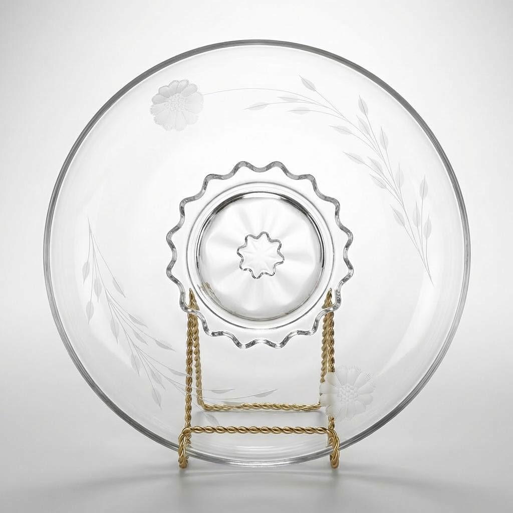 W.J. Hughes of Toronto was known for applying refined etchings to American pressed blanks in the early to mid 20th century. While Cornflower appears on more familiar forms, this low raised-base console is rarely documented in Line 210S. Its starburst platform and proportions align with 1930s Indiana production, making it an uncommon crossover example for serious collectors.