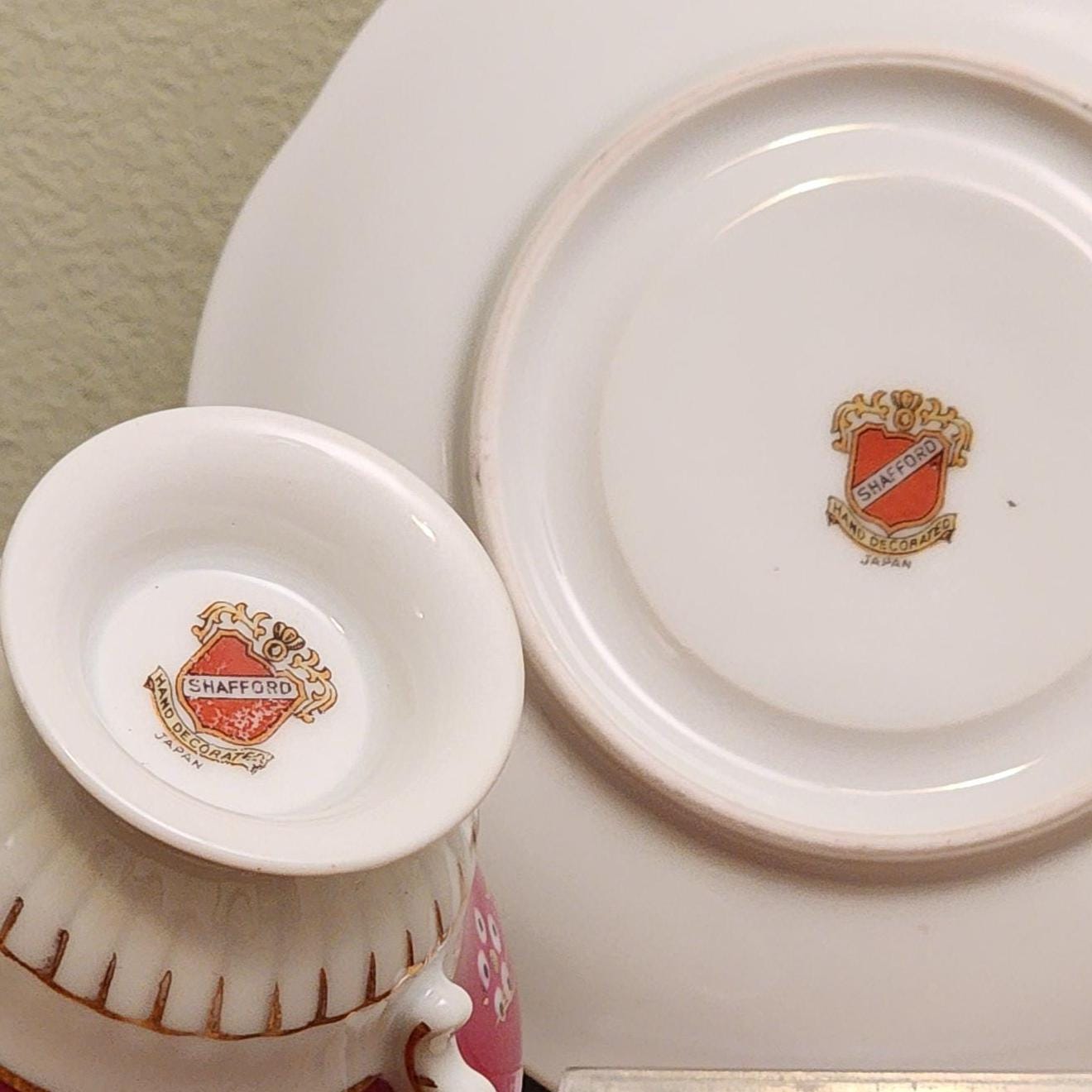 Produced in mid twentieth century Japan, this richly coloured set reflects the decorative elegance that defined Shafford export wares. Shafford pieces formed part of the flourishing postwar Japanese porcelain trade of the 1950s and 1960s, created for the North American market. Known for vibrant colour, generous gilding, and hand finished details, these sets remain highly collectible for their craftsmanship and enduring mid century appeal.