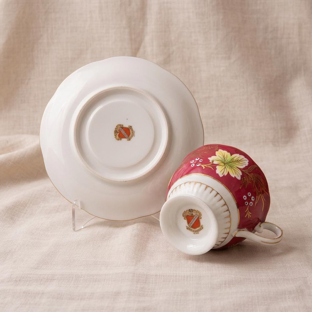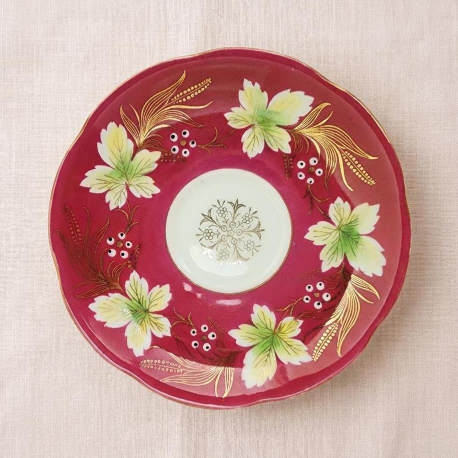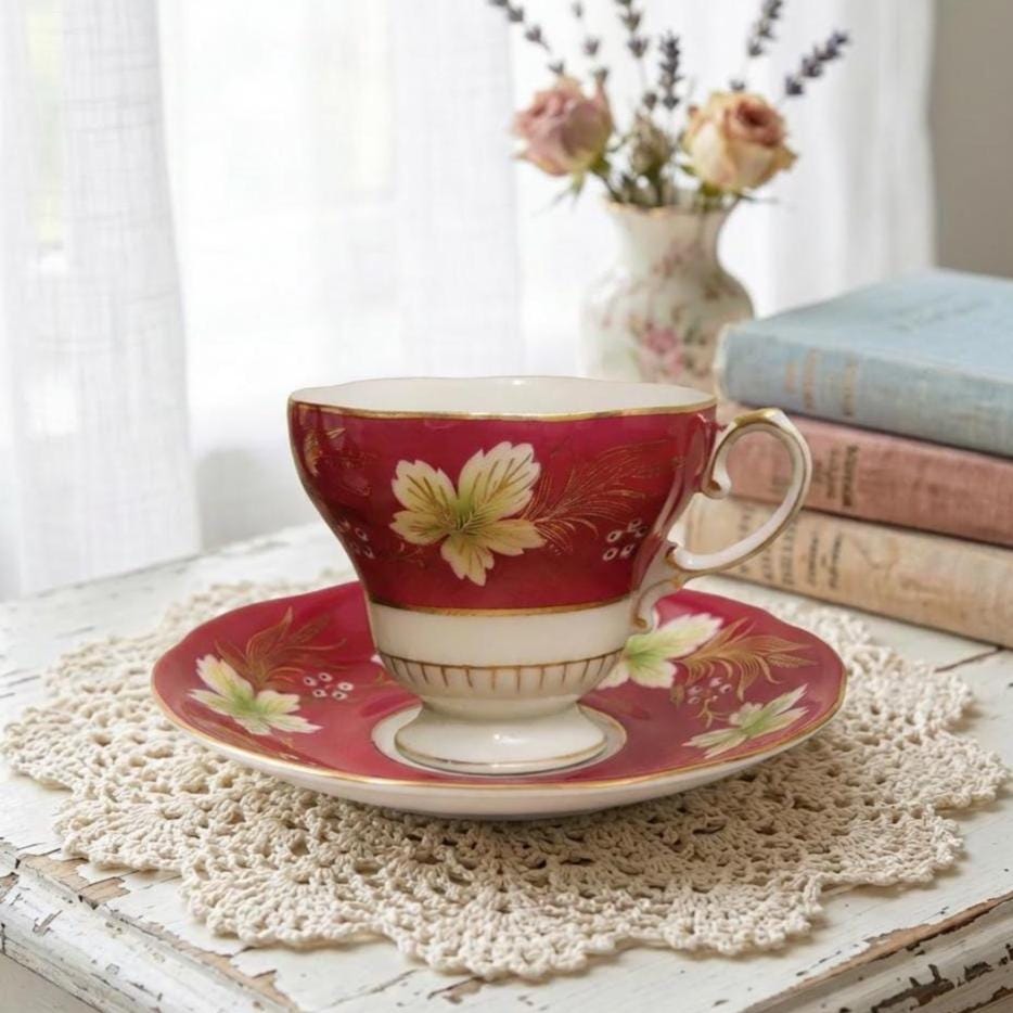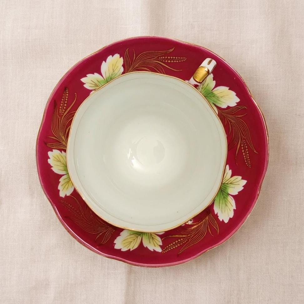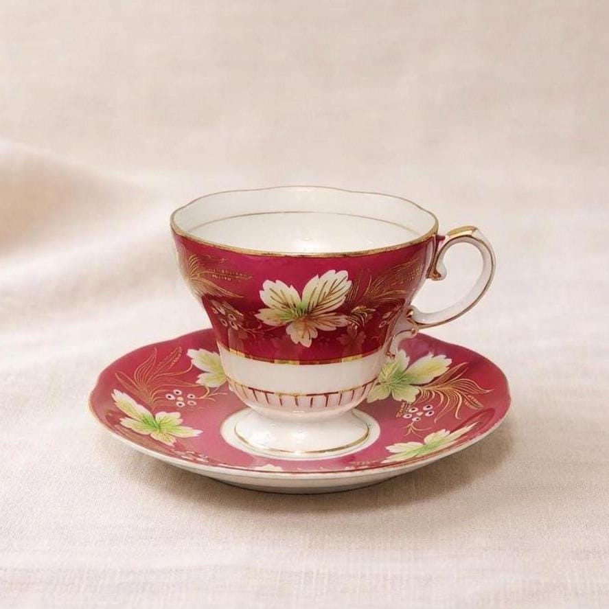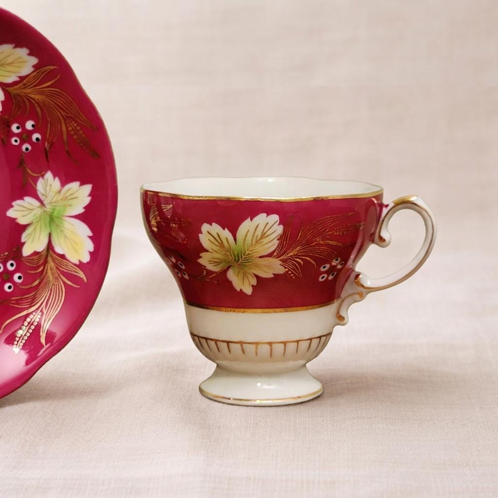 A vintage Shafford Japan cup and saucer in deep burgundy porcelain, hand decorated with florals and finished in bright gold trim. Yellow blossoms and green foliage scatter across the magenta ground, accented by delicate white berries and fine gilt detailing, while a scalloped rim, sculpted handle, and central gold medallion complete the composition, offering a bold mid century accent for tea service or curated cabinet display.