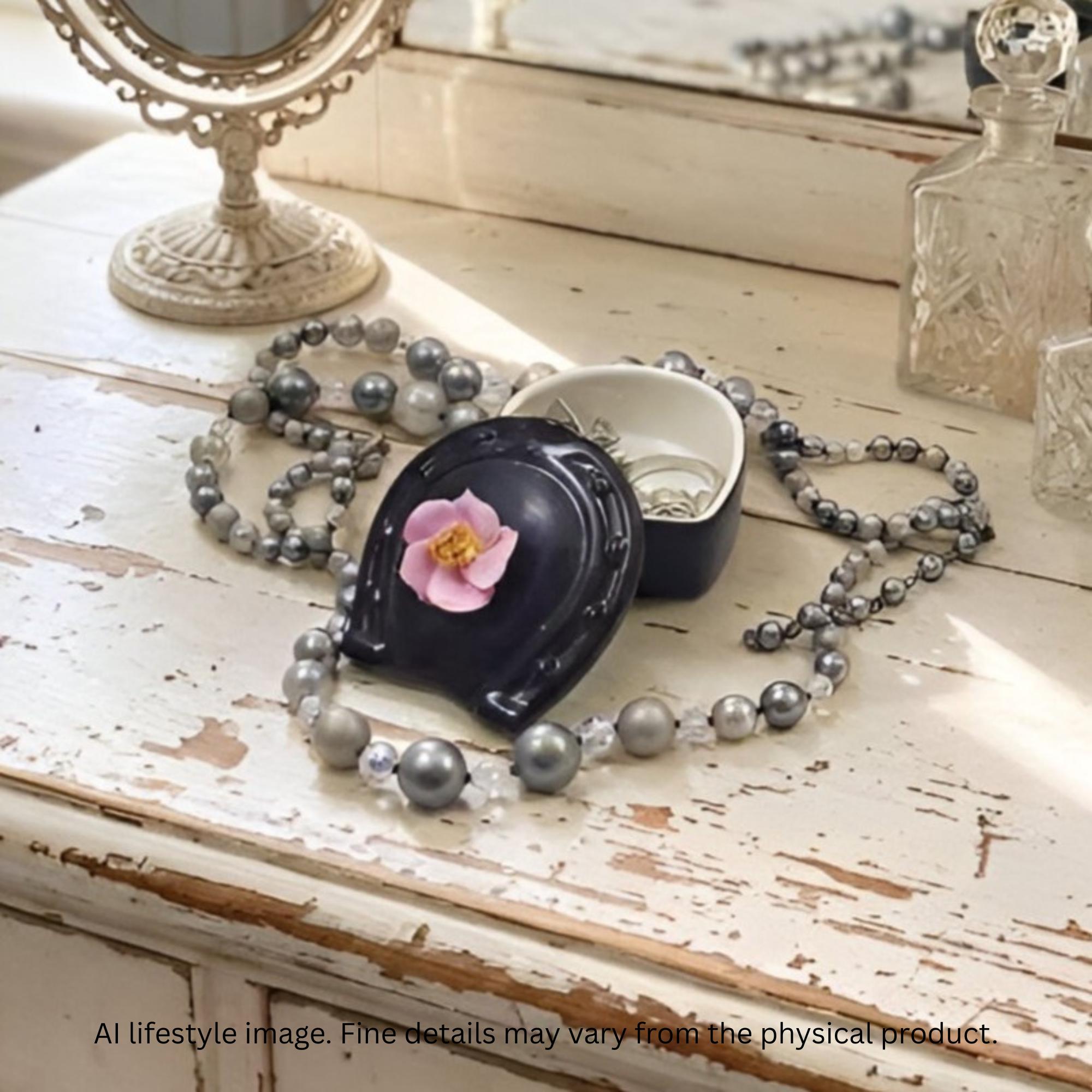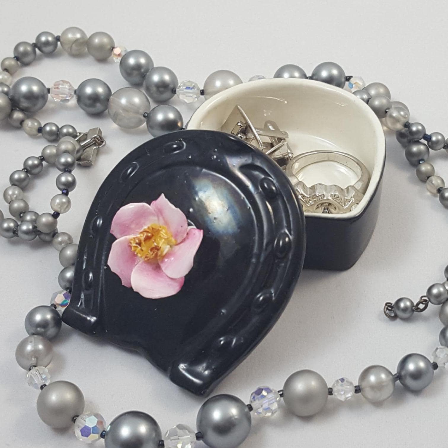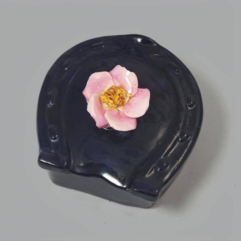 A Coalport bone china trinket box shaped as a horseshoe, ideal for jewelry storage or elegant vanity display. It features a glossy black exterior accented with a hand-applied sculptural rose in soft pink tones.