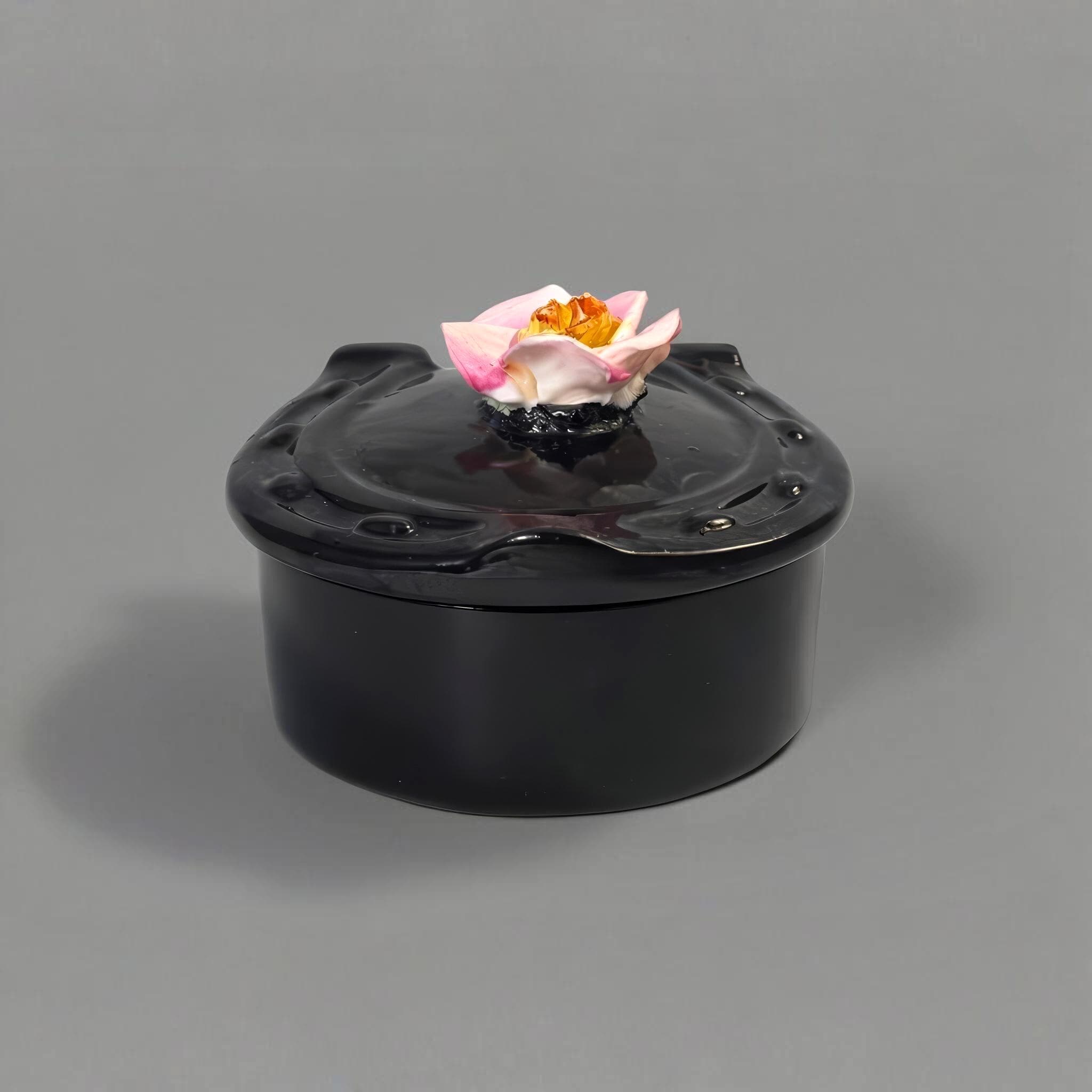 • Decoration: Hand-applied sculptural rose on glossy black ground