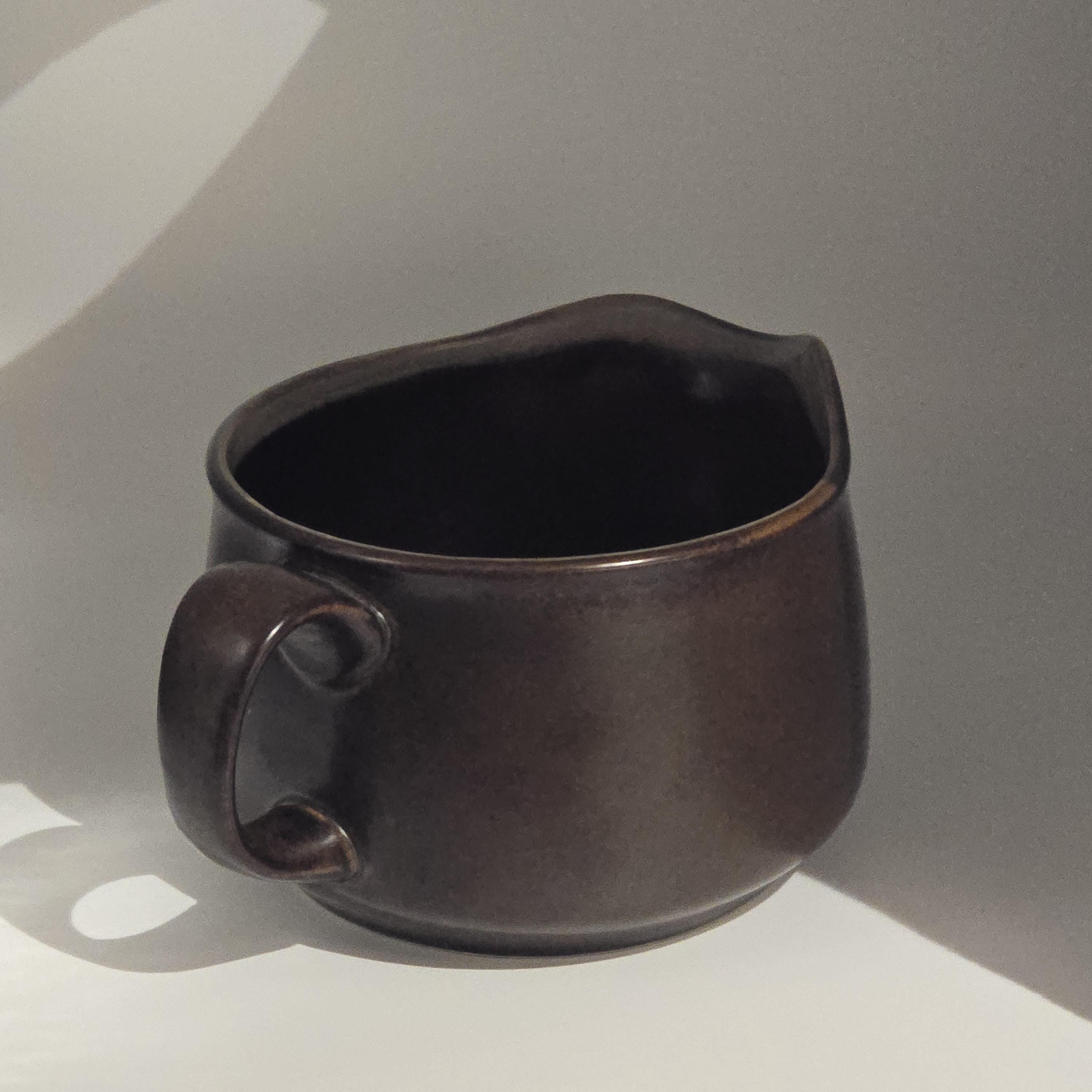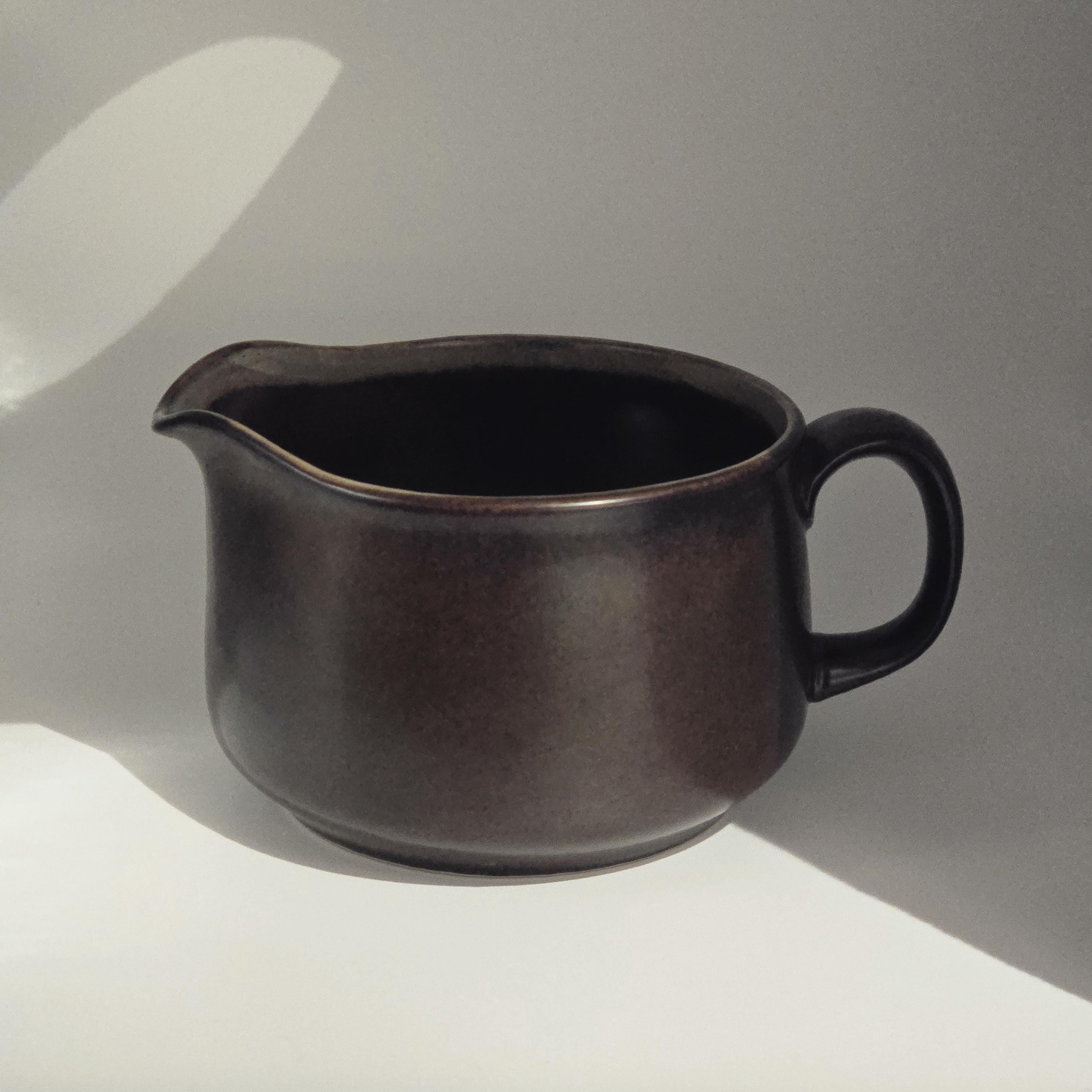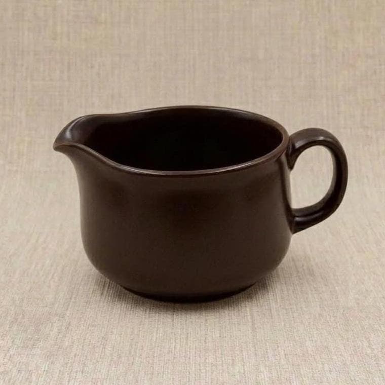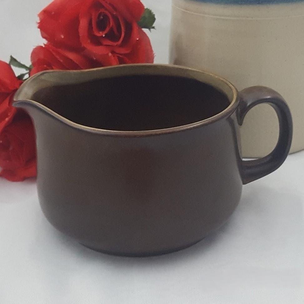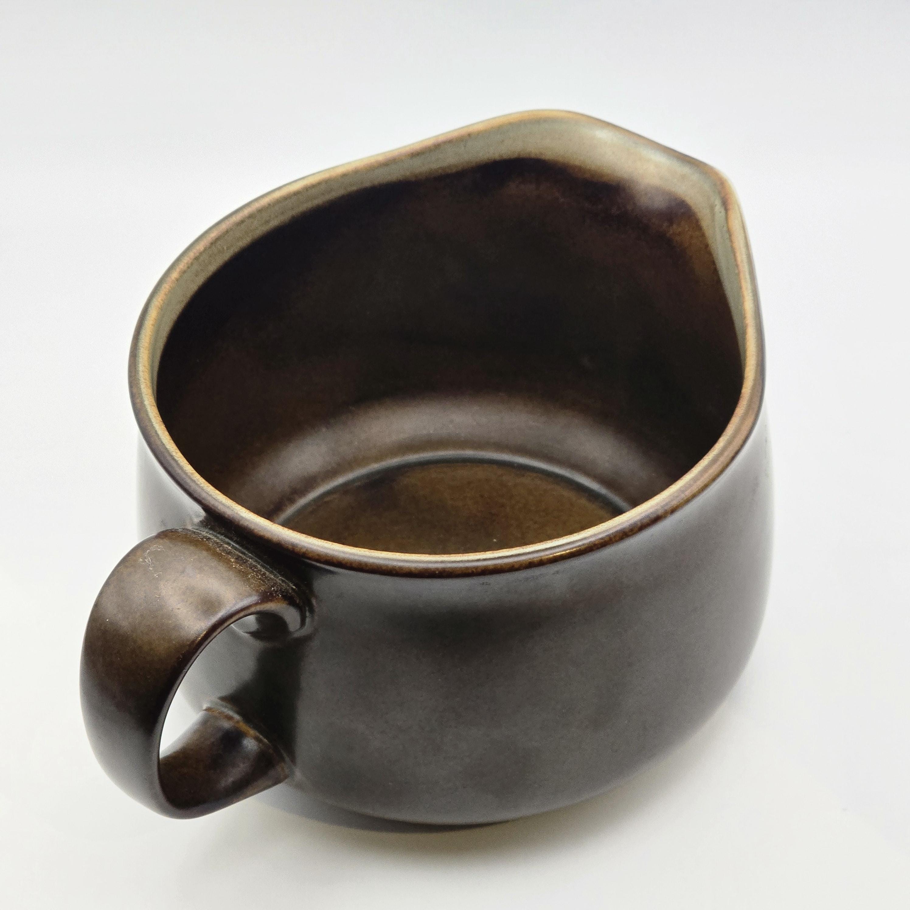 This mid-century English stoneware gravy jug features a rich brown glaze with subtle tonal variation, a rounded body, and a well-balanced pouring spout, reflecting the understated utility-driven design typical of English stoneware from the 1960s to 1970s.