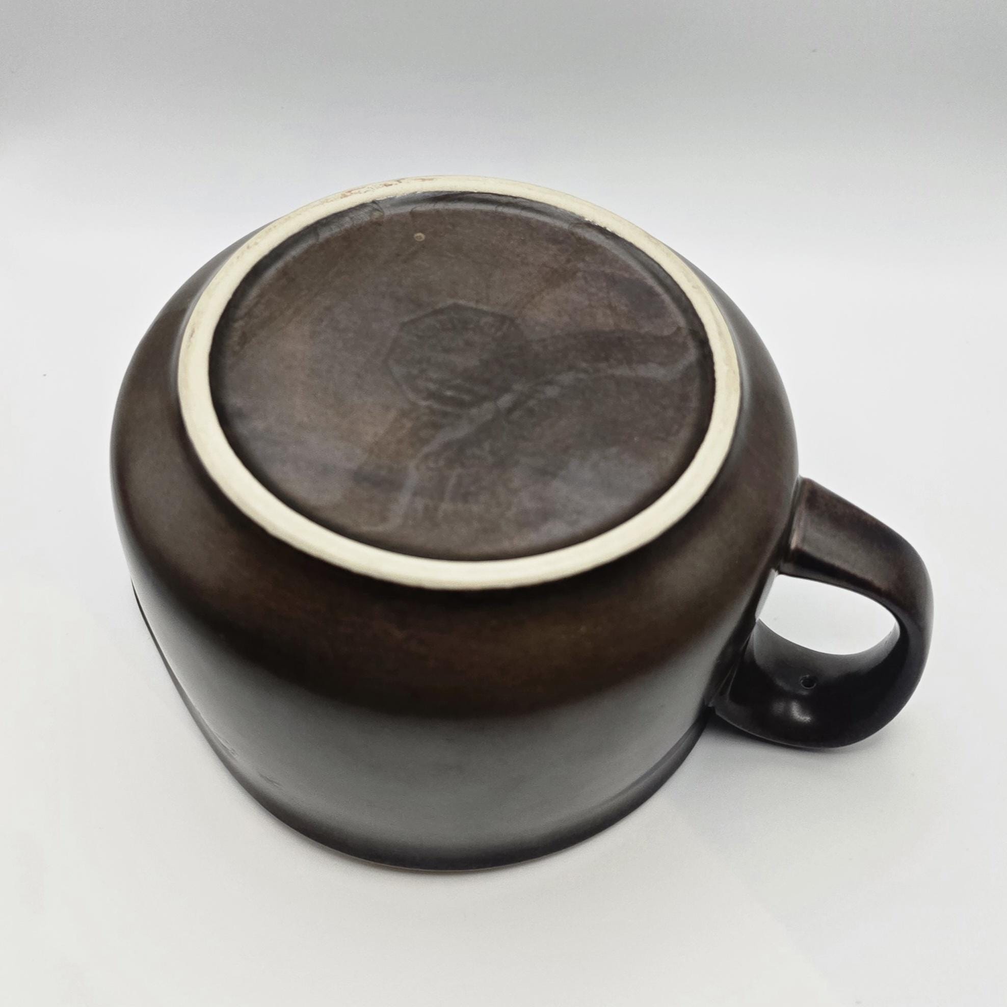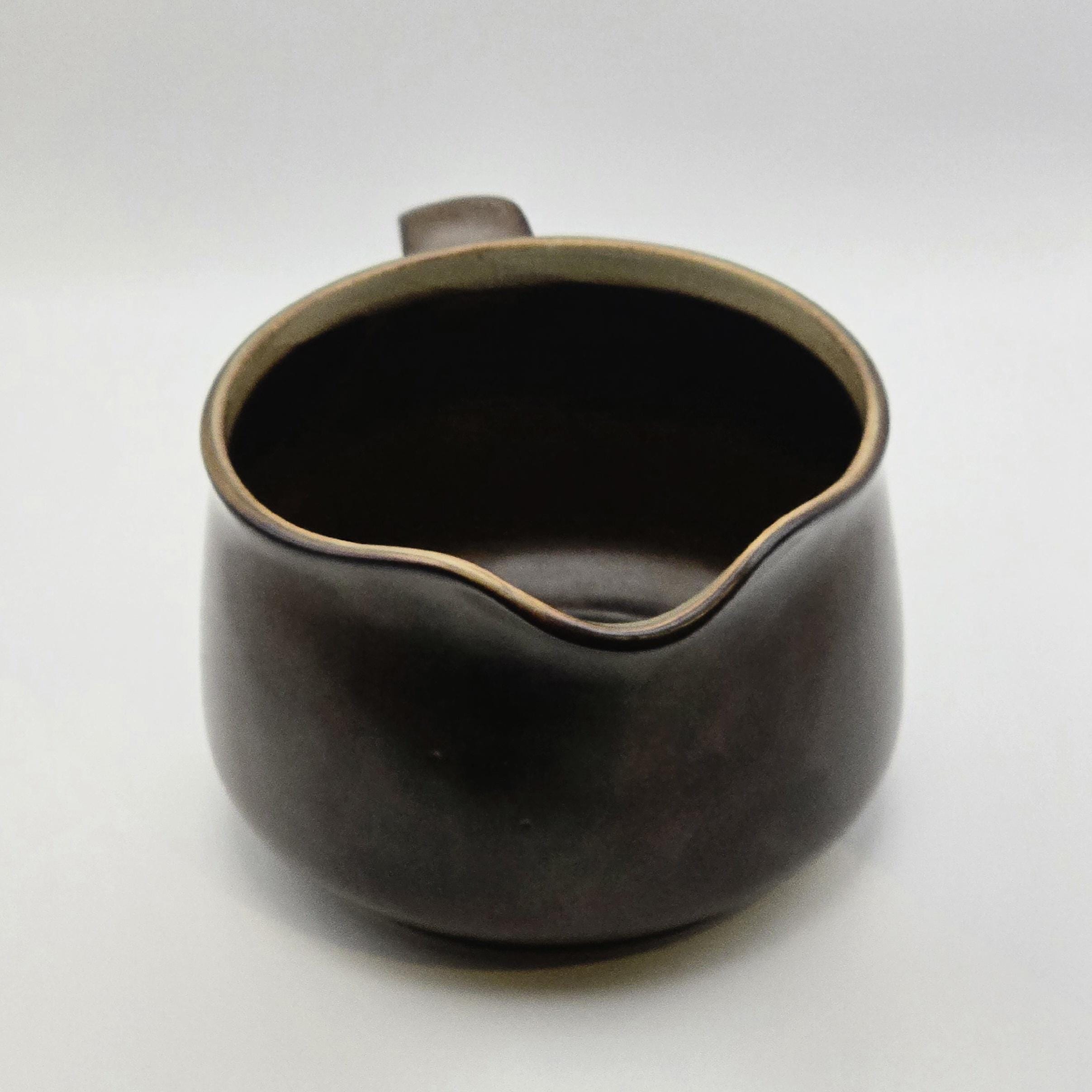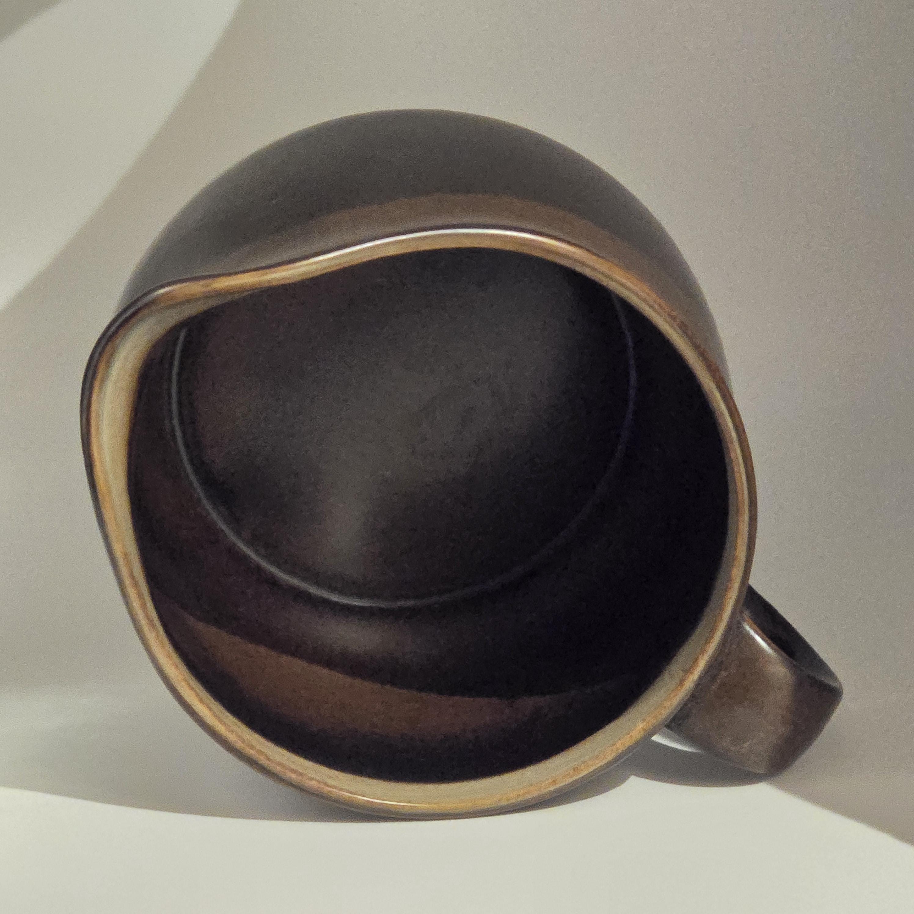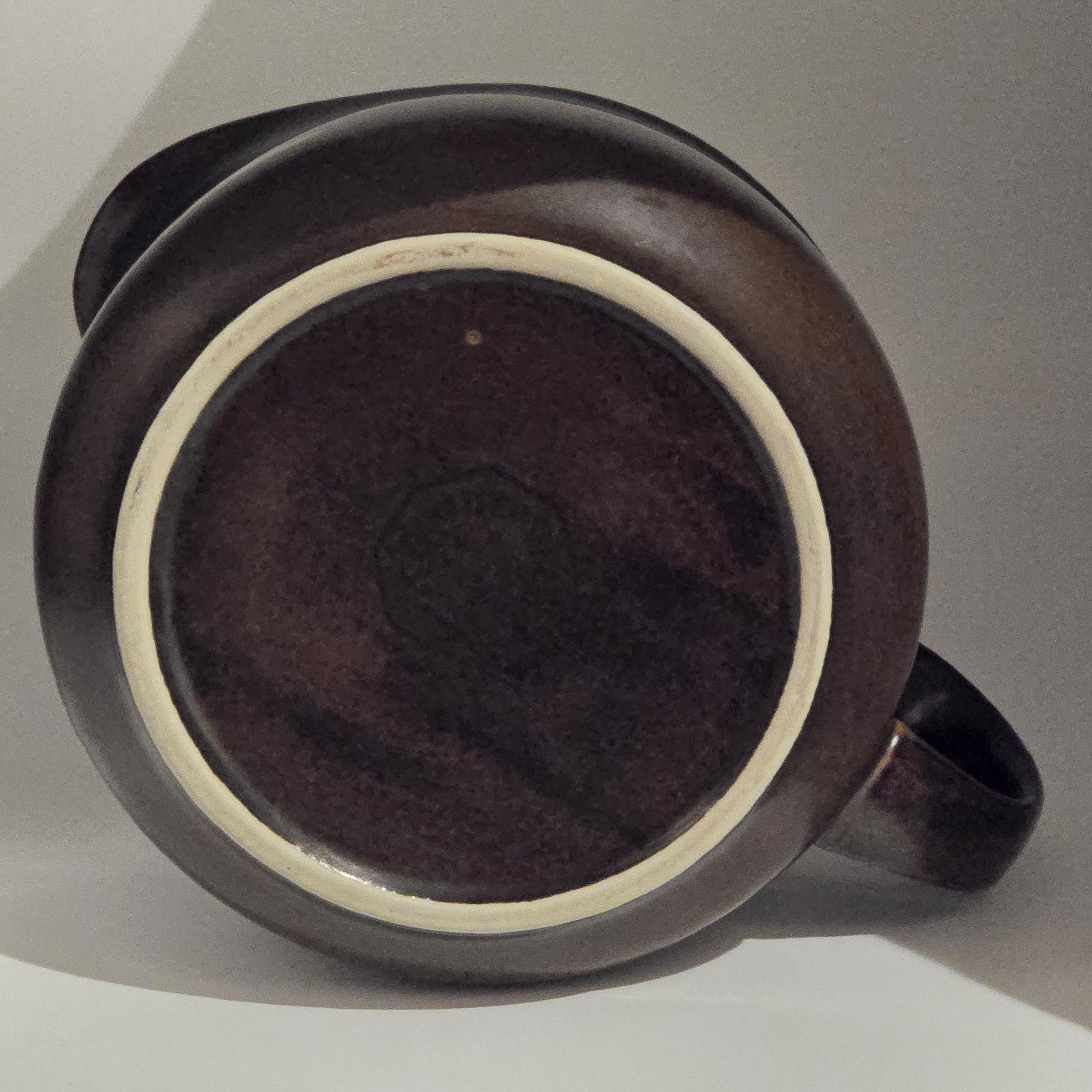 This mid-century English stoneware gravy jug features a rich brown glaze with subtle tonal variation, a rounded body, and a well-balanced pouring spout, reflecting the understated utility-driven design typical of English stoneware from the 1960s to 1970s.