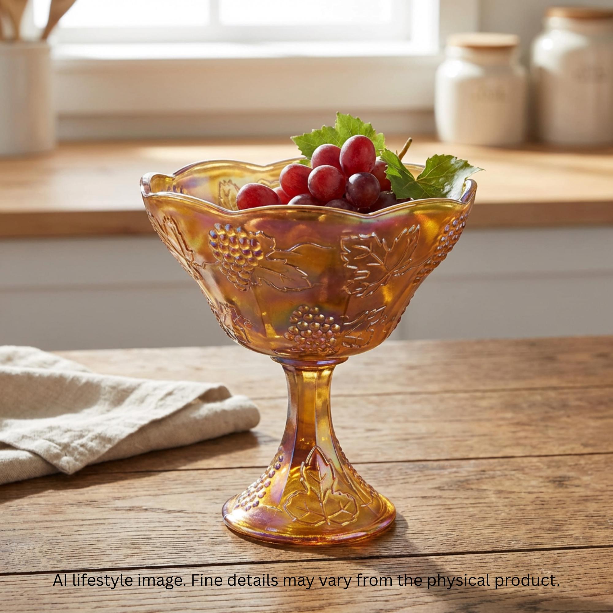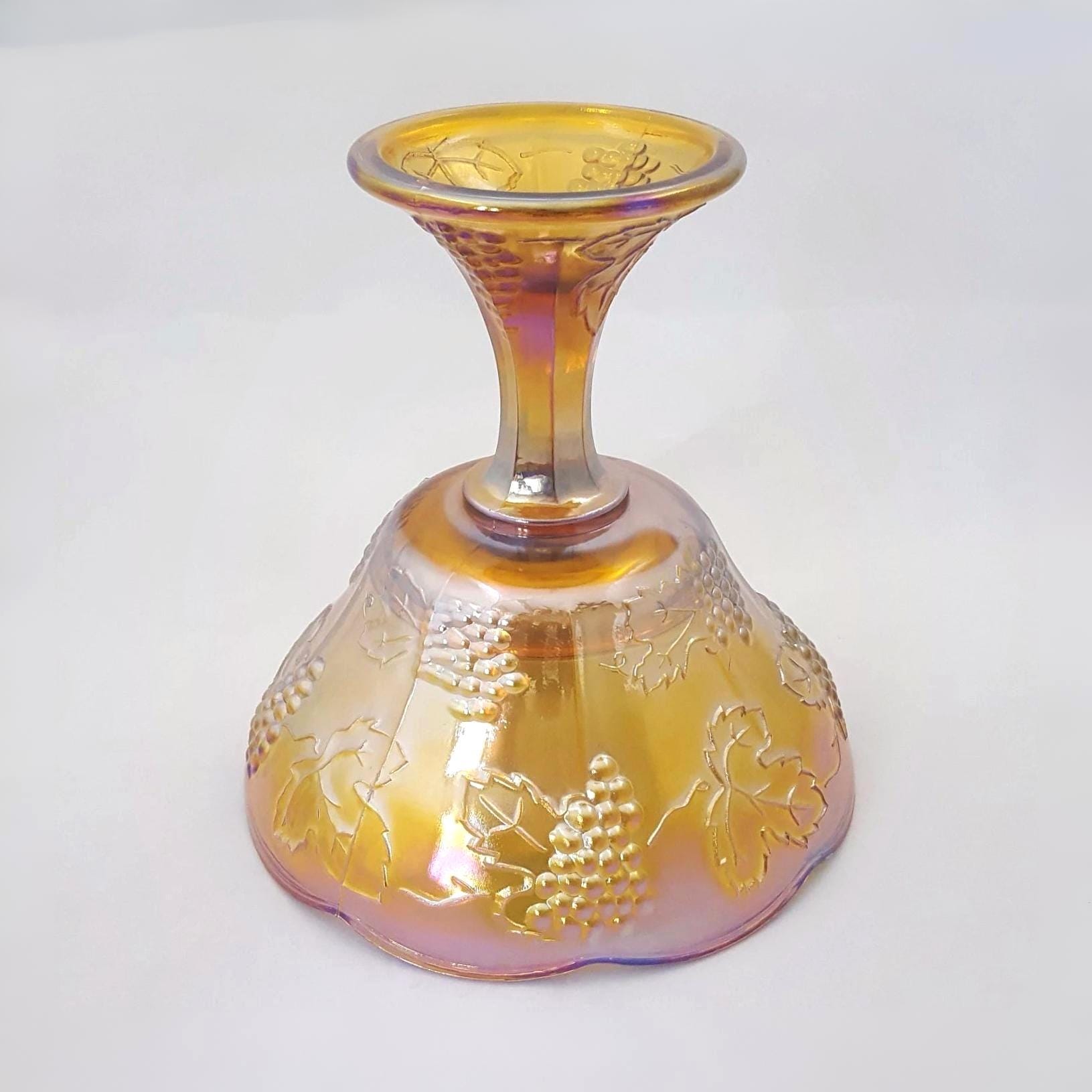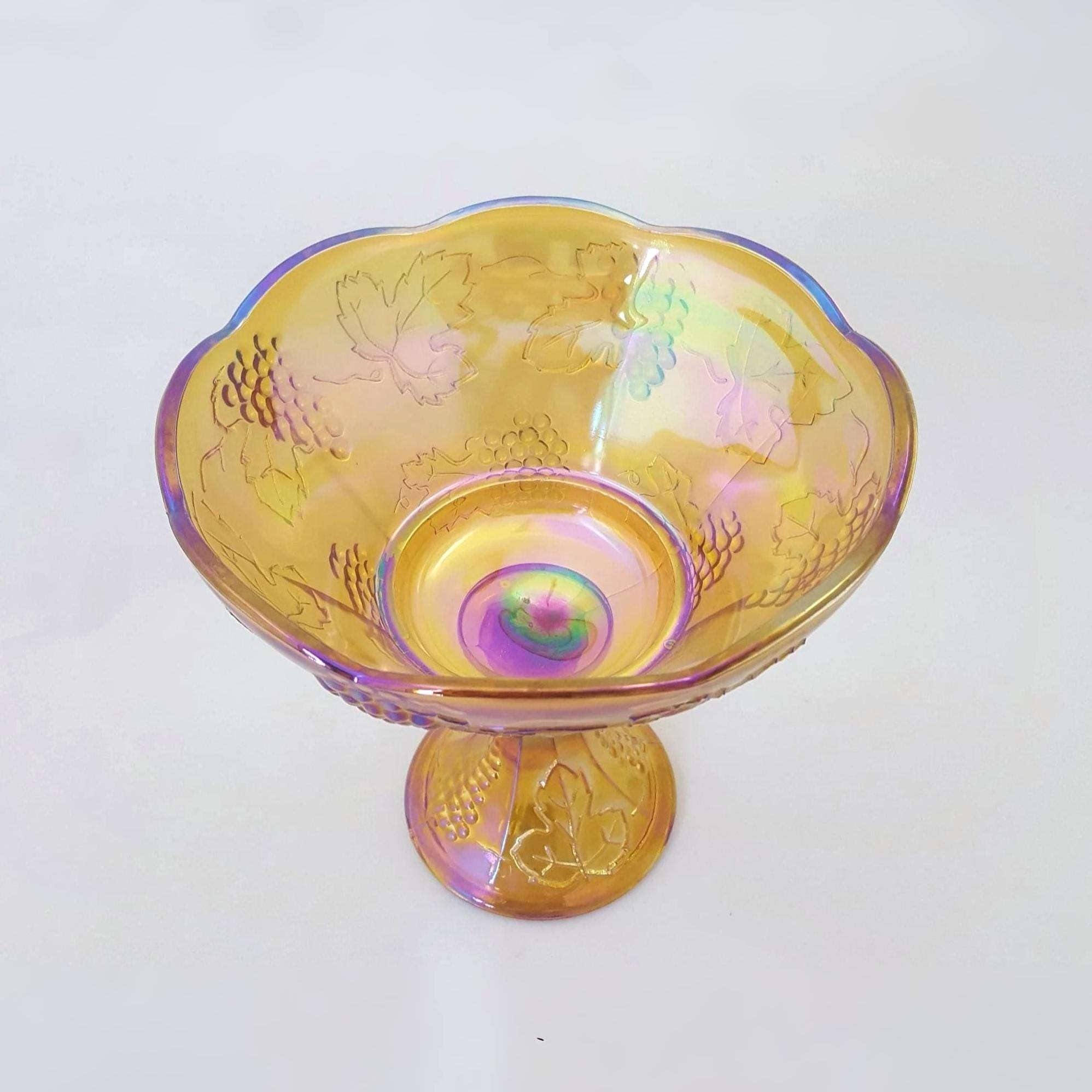 A vintage Indiana Glass Harvest Wedding pedestal bowl in luminous Iridescent Gold Carnival Glass. Its scalloped rim, raised grapevine relief, and glowing oil slick sheen create a striking yet elegant centerpiece. Perfect for serving fruit or sweets, or displaying as a radiant statement on a dining or console table.