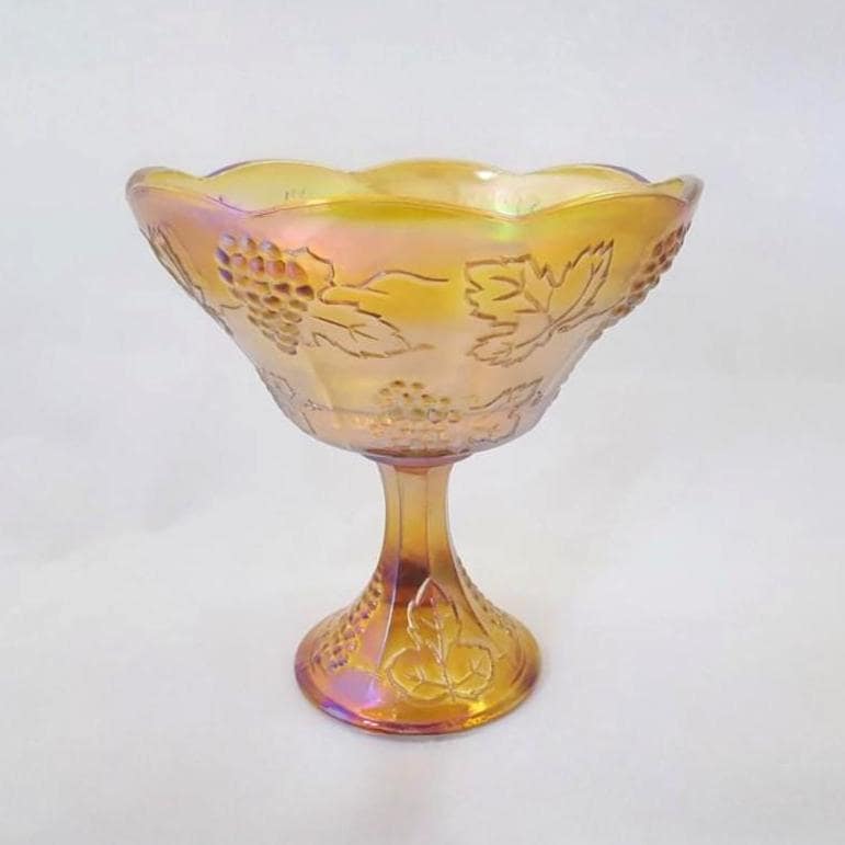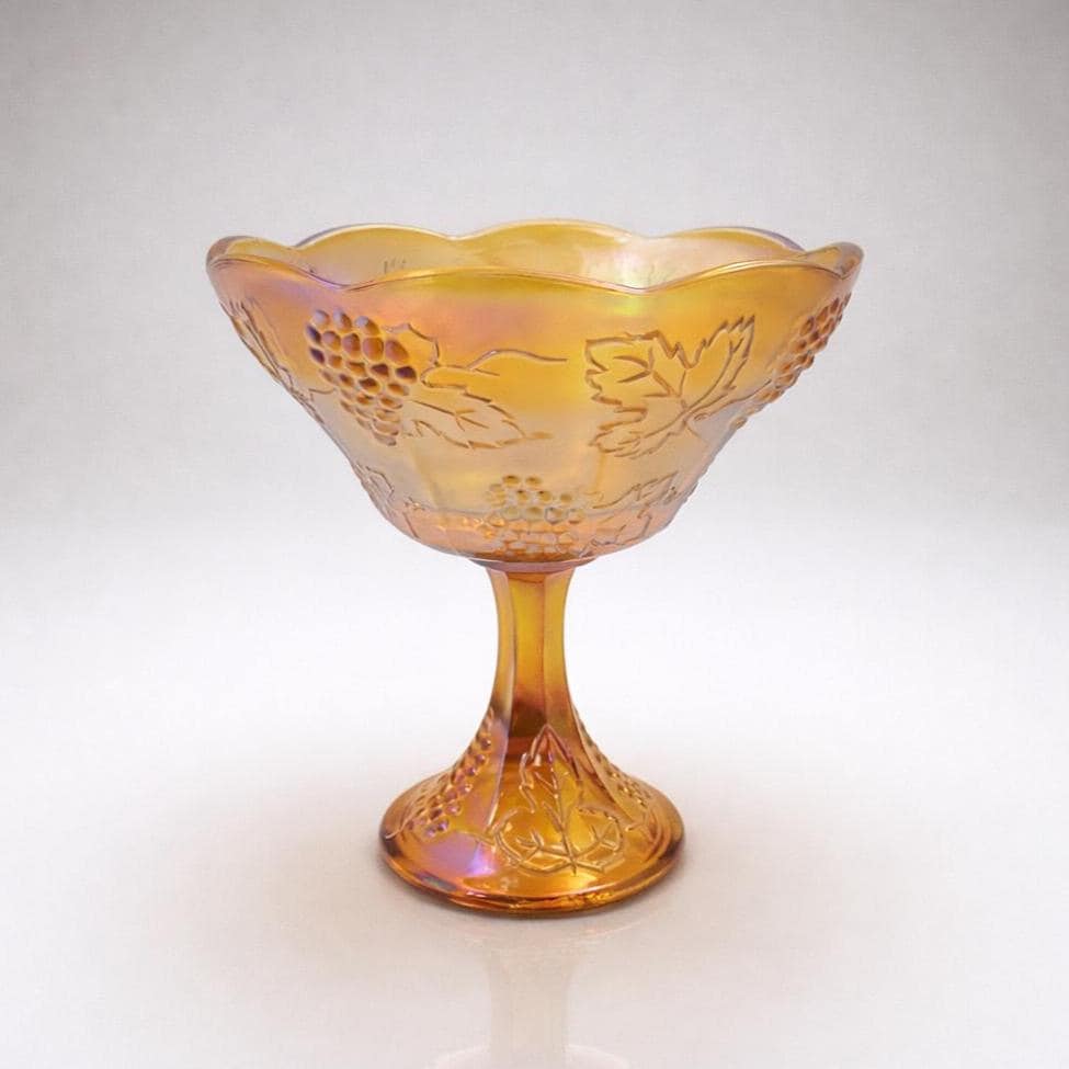 Produced by Indiana Glass during the early 1970s Carnival revival, the Harvest Wedding pattern became one of the company’s most recognized designs. Introduced in Iridescent Blue in 1971, with Gold following in 1972, this pedestal form reflects the era’s renewed appreciation for historic pressed glass motifs and shimmering finishes.