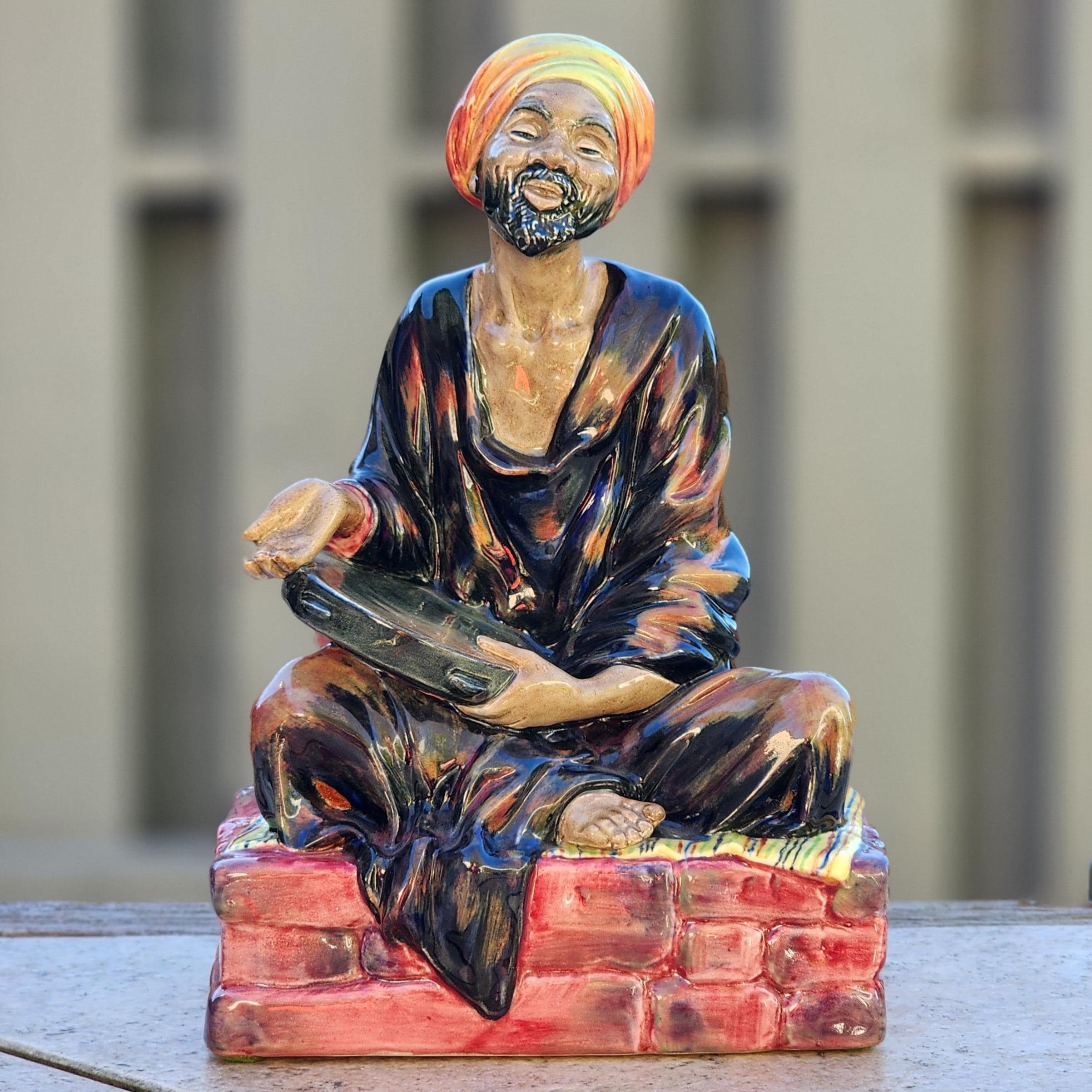 The Mendicant (HN1365) was first issued by Royal Doulton in 1929 and remained in production until 1969. Designed by Leslie Harradine, one of Doulton’s most celebrated modelers, the figure portrays a beggar or traveling musician holding a tambourine, dressed in flowing robes and a colorful turban. The detailed facial expression and relaxed pose reflect Harradine’s skill in conveying emotion and quiet dignity. The backstamp dates this example to the early 1930s, placing it among the earlier production period.