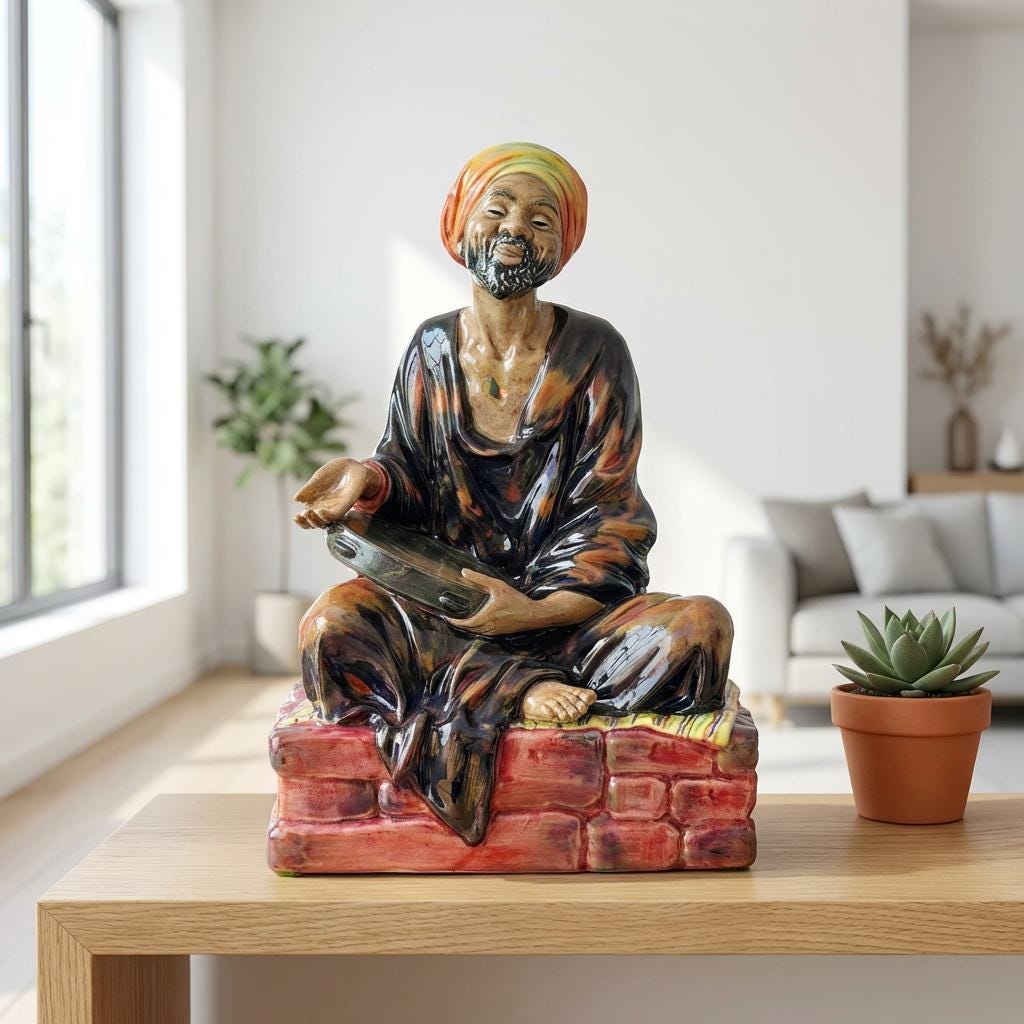 A vintage Royal Doulton figurine depicting The Mendicant, a seated street musician rendered with expressive detail and rich coloration. Designed by Leslie Harradine, this sculptural figure captures both narrative character and refined craftsmanship, making it well suited for display within a curated figurine or ceramics collection.