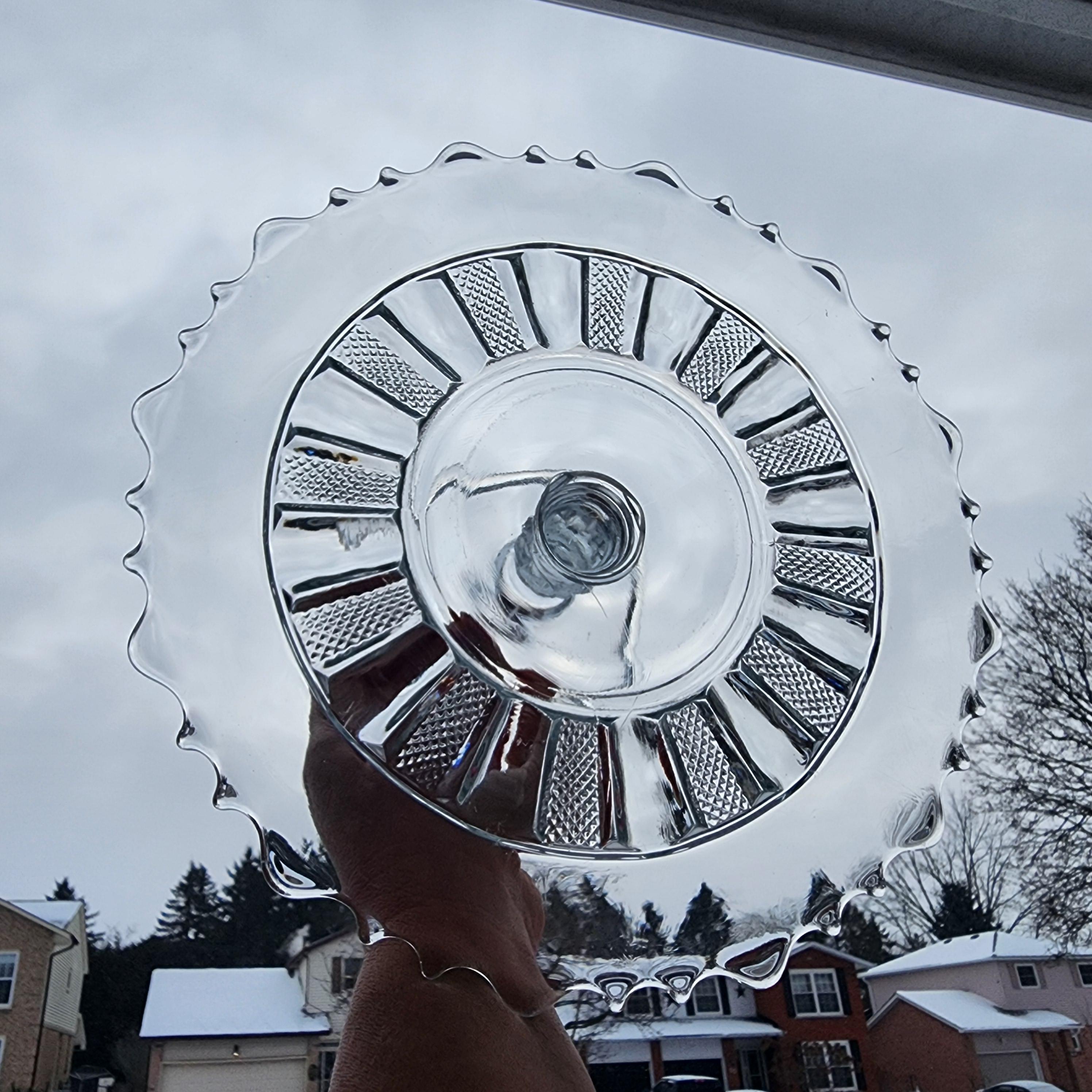 This pedestal cake stand is an elegant piece of antique glassware, likely from the Early American Pattern Glass (EAPG) period. It's attributed to McKee Glass due to the diamond pattern, which is common in their designs. The cake stand features a hatch and rib design with a diamond pattern on a wafer stem and a rippled edge. It's perfect for serving cakes, cupcakes, and pastries, making it a wonderful addition to any tea set, glassware collection, or vintage-themed event.