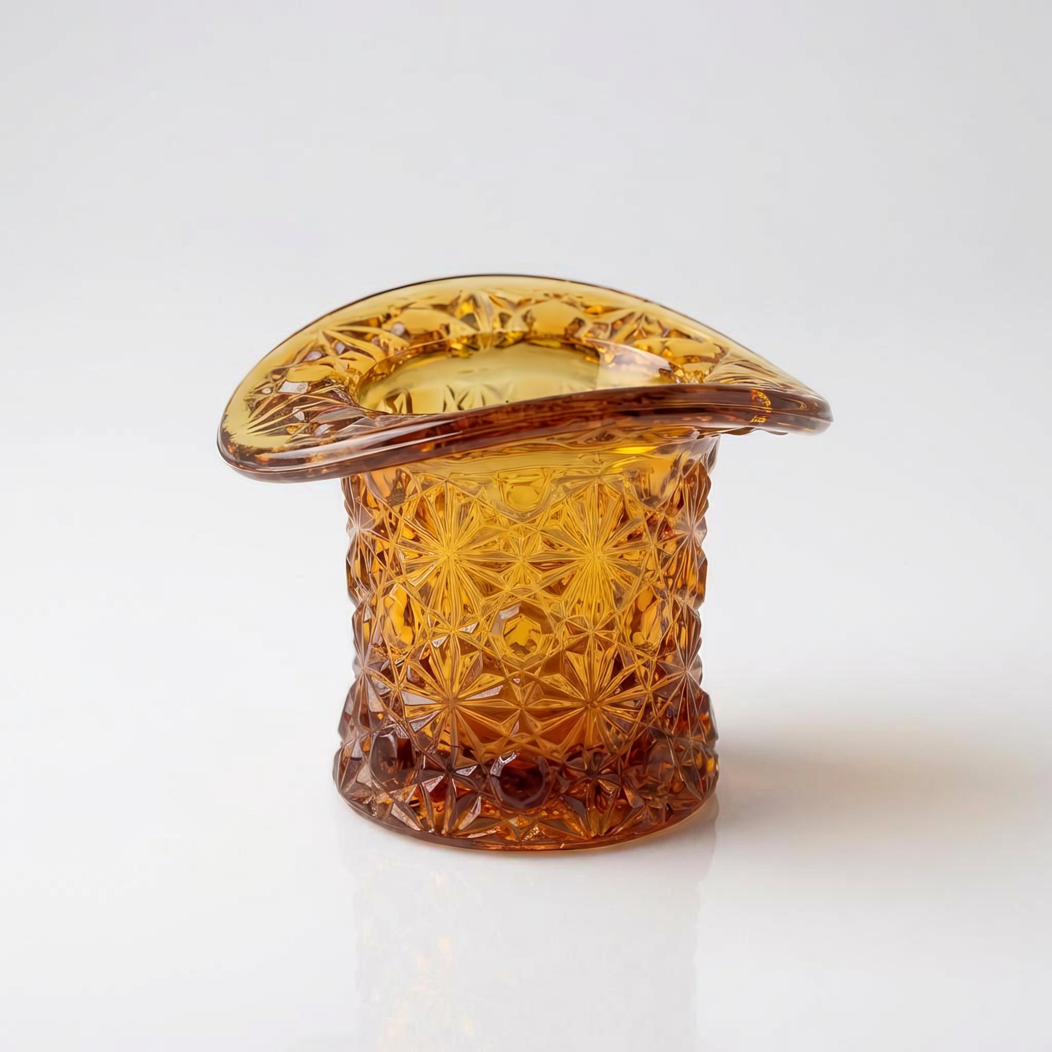First introduced in the late 1930s and revived in the 1950s, Fenton’s Daisy and Button pattern became a beloved pressed glass classic. This miniature top hat form reflects the popularity of novelty shapes produced during the 1960s and 1970s in rich amber hues.