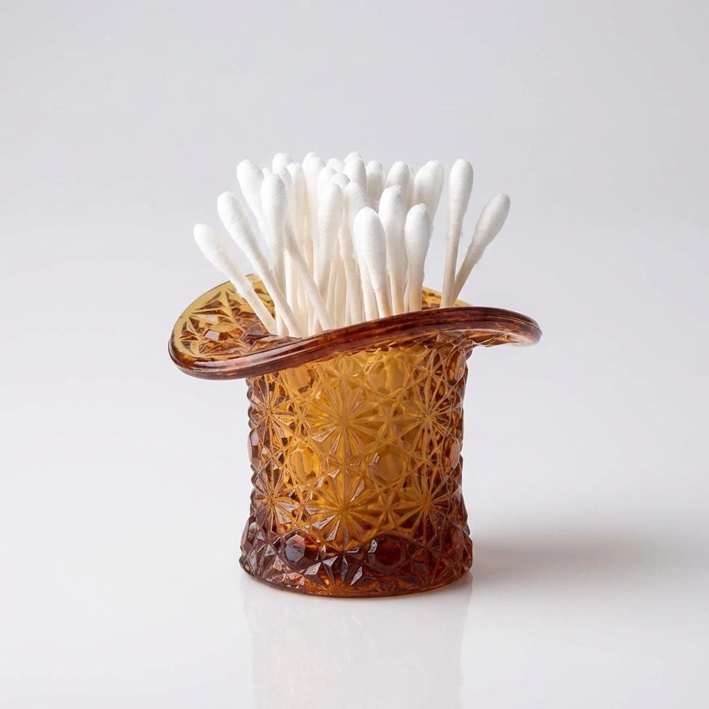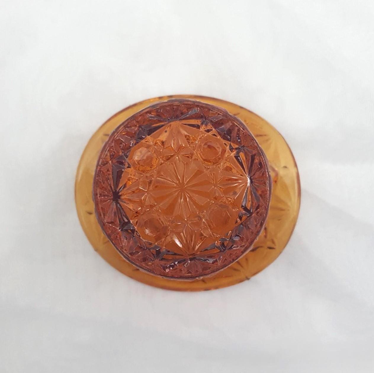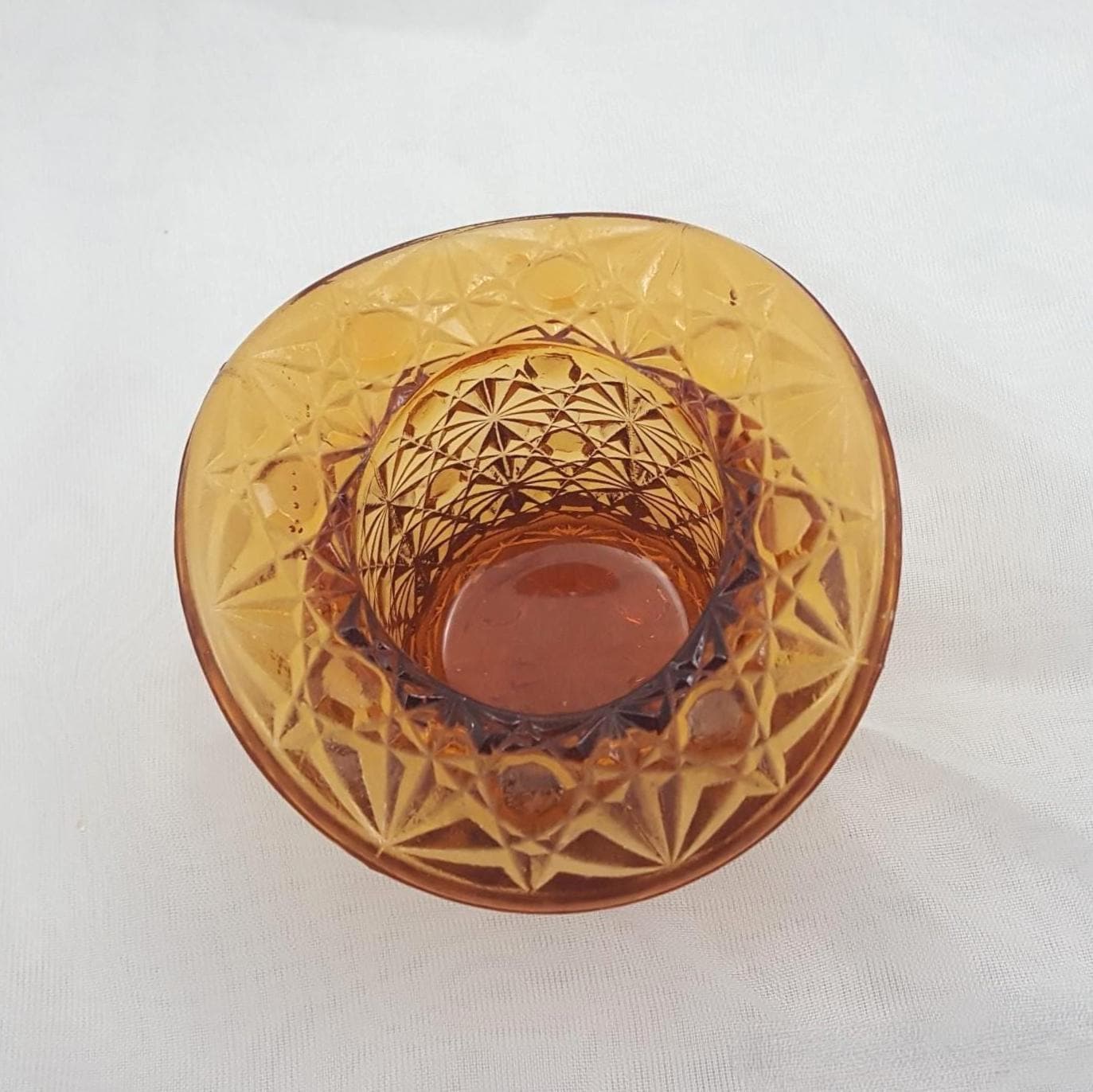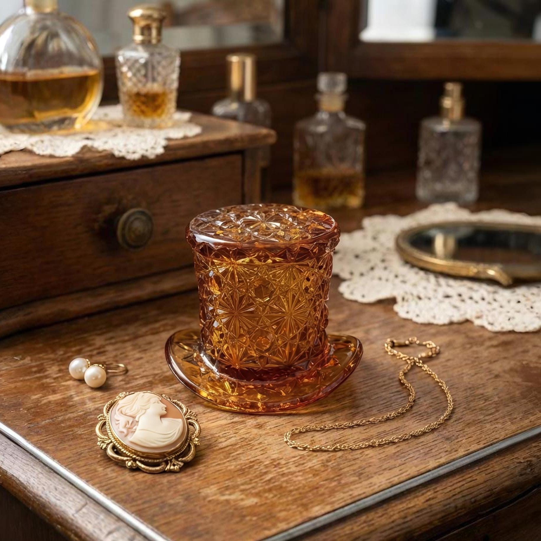 A vintage Fenton Daisy and Button amber glass top hat featuring raised floral and starburst detailing that captures and reflects light beautifully. Its compact size makes it ideal for toothpicks, cotton swabs, cosmetics, small jewelry, or as a warm honey toned accent on a vanity, dresser, or shelf.