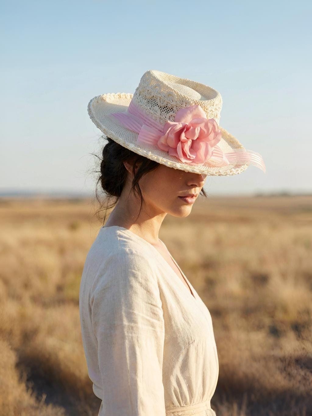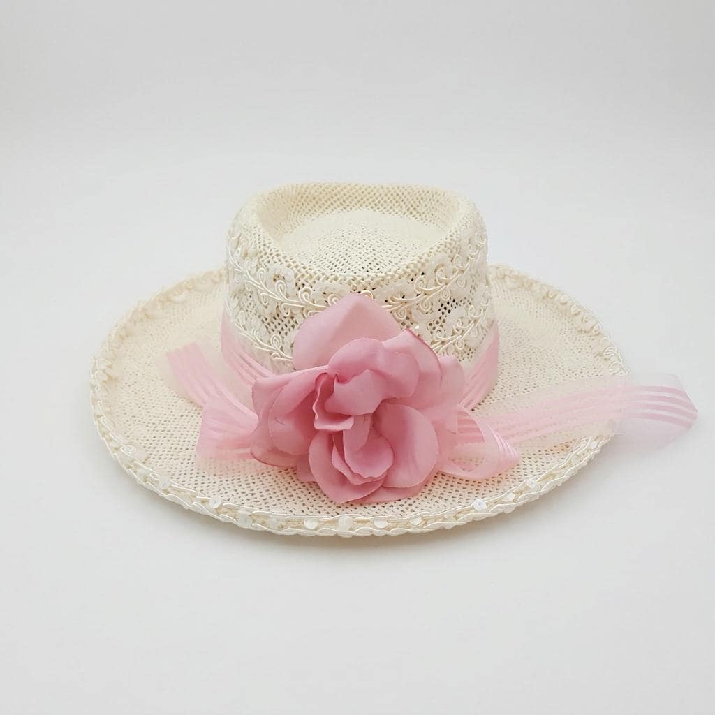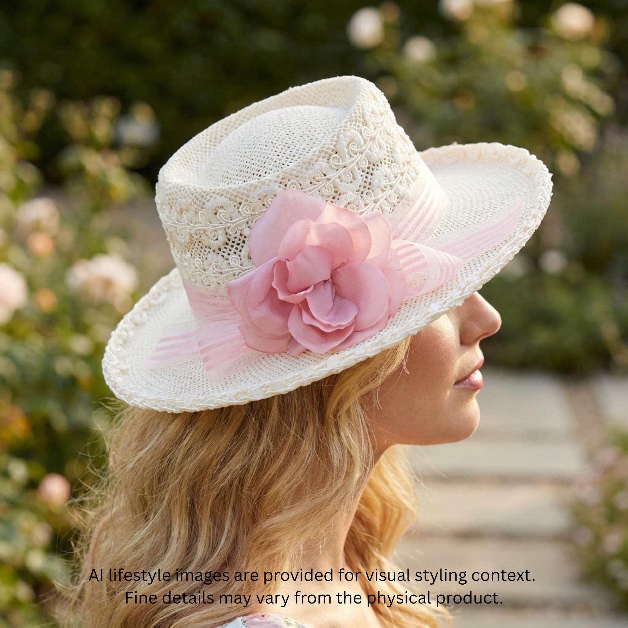 • Decoration: Pink ribbon band with rose accent and delicate lace overlay
