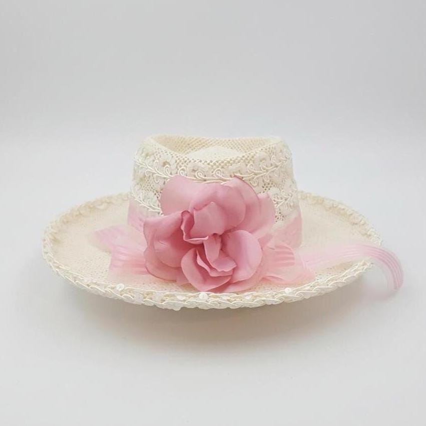 A vintage 1980s Caché lace hat adorned with a soft pink rose ribbon, blending romantic femininity with a playful cowboy silhouette. Its delicate open weave and sculpted crown create airy elegance, making it perfect for weddings, garden parties, spring portraits, or styled vintage inspired celebrations.