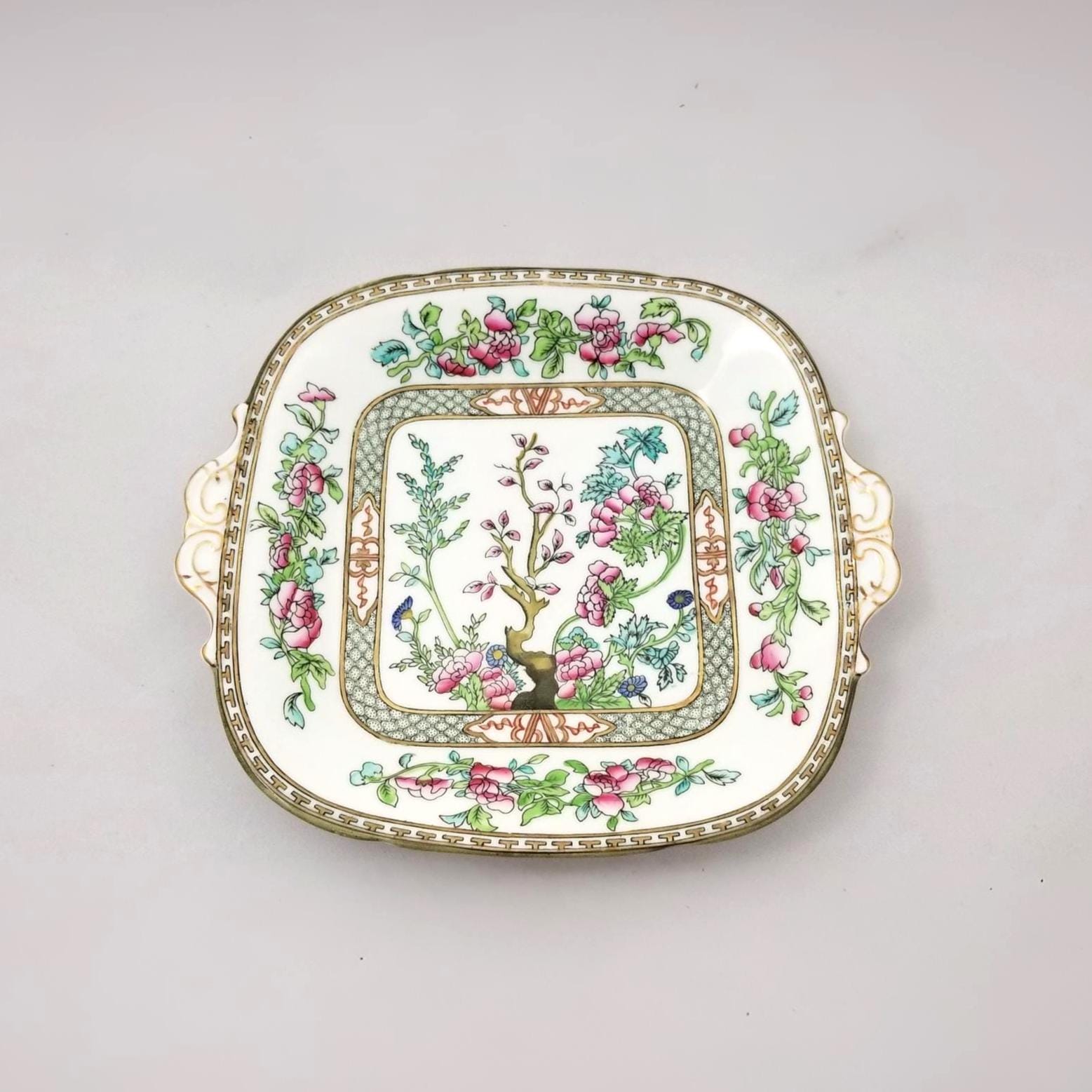 An antique Coalport Indian Tree scalloped square cake plate with side handles, beautifully decorated in the iconic pink and polychrome floral motif. Framed by green and brown trim with gilt accents, this elegant English porcelain piece serves beautifully for cakes, pastries, or refined afternoon tea presentation.
