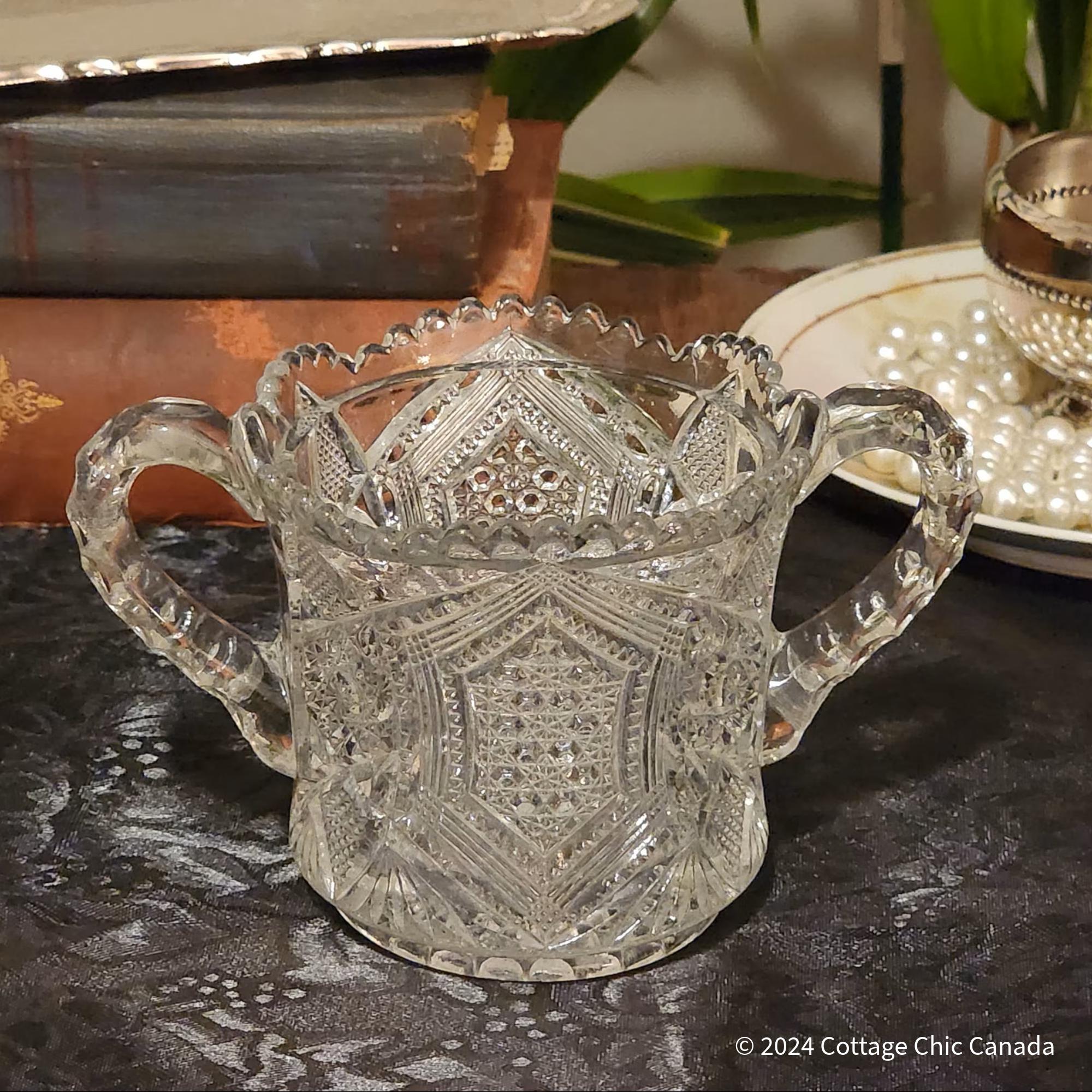 Vintage Imperial Glass “Hexagon and Cane” sugar bowl – a striking piece of American pressed glass, ideal for adding sparkle to tea service, dining display, or vintage kitchen décor.