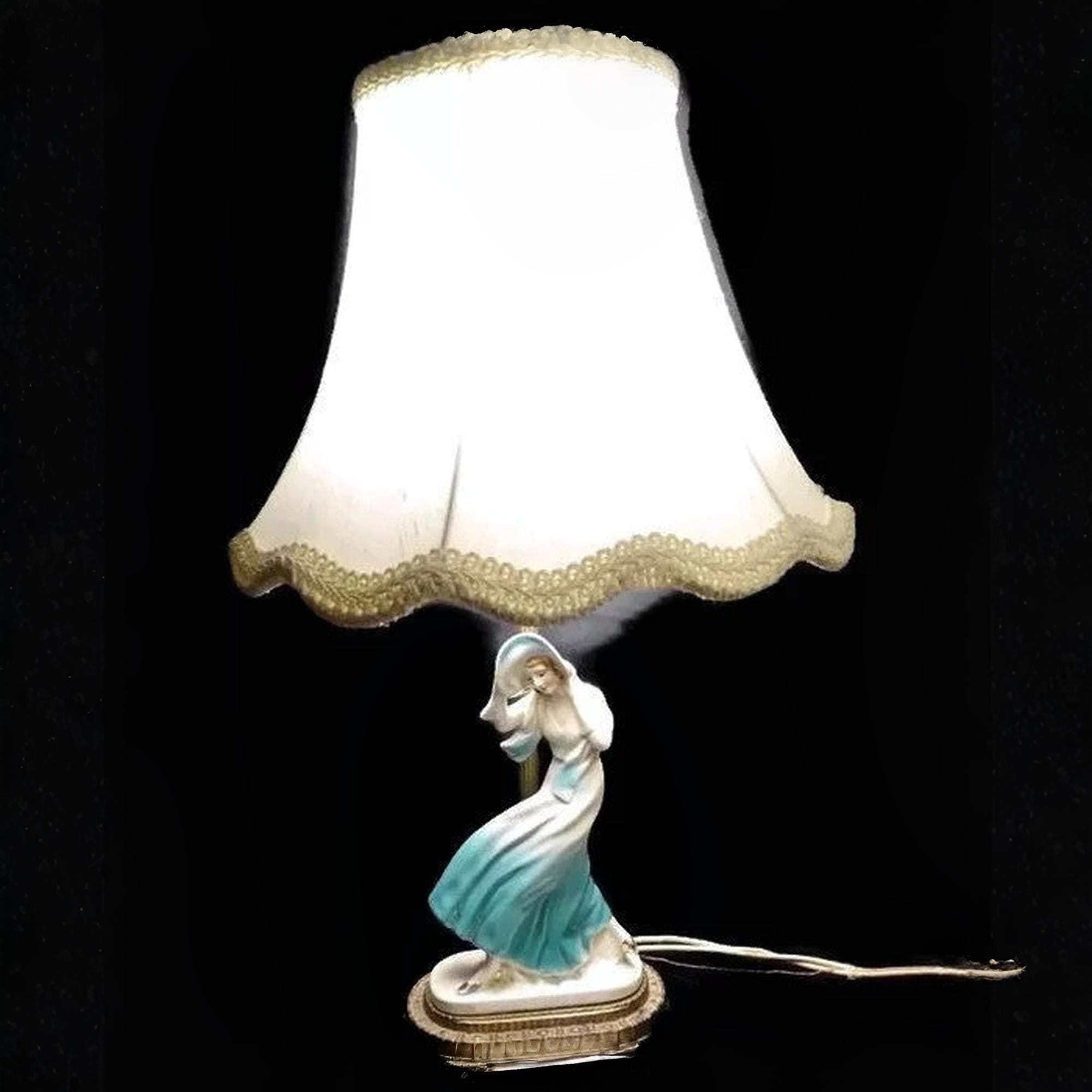 An early to mid 20th century ceramic figural table lamp designed to cast a soft accent glow for bedside or dressing table use. The sculptural female figure, dressed in a flowing turquoise and ivory gown, reflects the period’s romantic approach to decorative lighting.