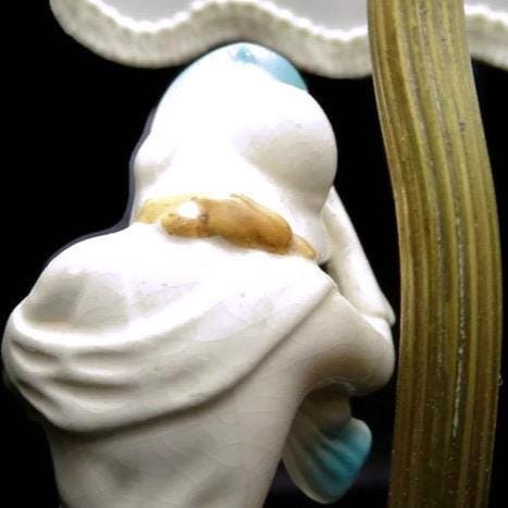 Figural ceramic lamps were popular during the interwar and immediate postwar period, prized for their expressive forms and decorative presence. The soft glazing, hand painted details, and original wiring components, including a fabric covered cord and early non polarized plug, are consistent with early to mid 20th century production, with period shades now increasingly uncommon.